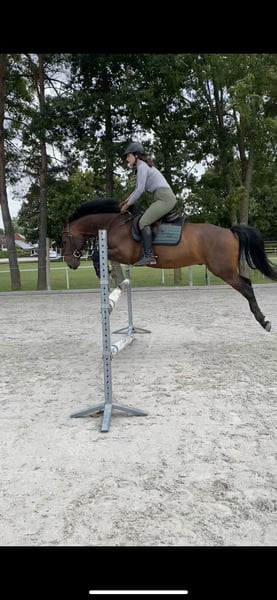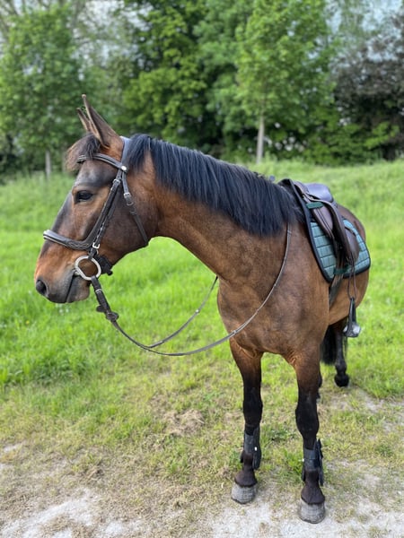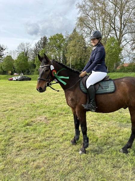 This 7.5-year-old Old Württemberger gelding (approximately 15.7 hh) impresses with his confident demeanor and versatile usability. He is secure in the terrain, fearless, and always well-behaved and reliable. He has gained initial competition experience (show jumping up to A-level) and has already had a taste of eventing. He consistently shows motivation, honesty, and a strong desire to please his rider. Whether for training, hacking, or new tasks – he handles almost everything with ease. An ideal partner for leisure riders seeking a straightforward, brave horse that is fun to ride and ready for any adventure. I can also very well imagine him as a family horse. Anton has been living in a herd environment since he was 3.5 years old, in an open stable herd. I would like to see this continue, as he is a very social horse. No riding schools or clubs, as he needs a stable, familiar person or handler.