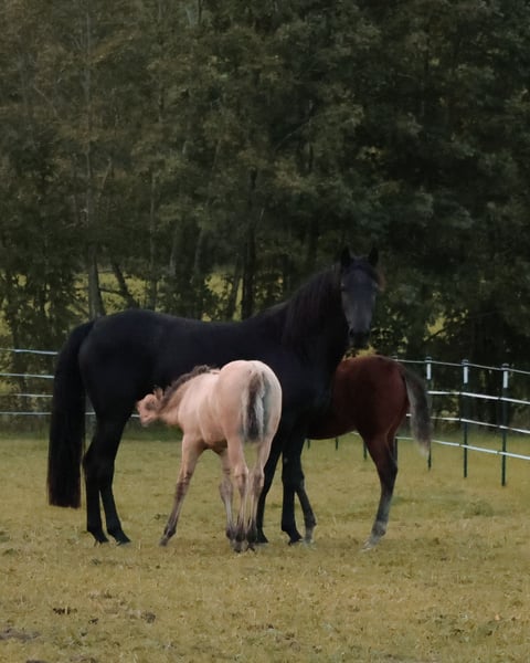 Emma is a wonderful, truly typical Morgan mare. She has recently had two excellent foals by RBD Thor Dun N Gold. She always readily accepts her foals, experiences no issues during foaling, and is an excellent mother who also allows other foals to nurse. We broke her gently last year; she is very intelligent and eager to learn, and she looks after her rider as well as her foals. She loves people and animals, especially children, so it would be ideal if she could join a family with kids. She was conceived in America, her sire is JMF True North. Although she is not very tall, she comfortably carries larger riders and passes on her size to her foals. Emma is well-behaved under saddle, but after her foaling break, she is ready to get back into work and still has the fire for it. Even as a somewhat cautious rider, I always felt safe riding her. Currently, she is coming out of her foaling break and needs to rebuild her muscle tone. A personal meeting is a prerequisite for Emma to move to her new home. If you are interested in Emma, please tell us a bit about yourself :-) Her registered name in the USA is Expats Truly Amazing.