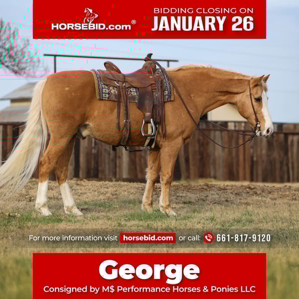 𝐉𝐀𝐍𝐔𝐀𝐑𝐘 ⭐️𝑨𝒍𝒍 𝑺𝒕𝒂𝒓 𝑳𝒊𝒏𝒆𝒖𝒑⭐️ Happening now thru MONDAY | JANUARY 26th - Available EXCLUSIVELY on HorseBid's website! For more details and to register visit: www.Horsebid.com CONSIGNOR CONTACT: M$ Performance Horses & Ponies LLC 661-817-9120 LOCATION: Stephenville,Texas BREED: Morgan Cross REGISTERED: No REGISTERED NAME: George COLOR: Palomino HEIGHT: 15.2 AGE: 15 GENDER: Gelding Have you ever dreamed of owning your very own John Wayne “Trigger”? That eye-catching golden horse with the calm confidence and steady presence that turns heads wherever he goes? Here’s your chance. Meet George, a striking 15-year-old gelding standing a solid 15.2 hands tall. George is the kind of horse that fits into just about any program — big, stout, and comfortable to ride, with a kind disposition and an honest way about him. George has an extensive, real-world résumé that speaks for itself. This past summer, he was used heavily giving guided trail rides, carrying riders of all experience levels and handling new situations with patience and ease. Because of this, he is a seasoned, dependable trail horse that has truly seen the world. George is confident going out alone or in a group, crosses water, bridges, logs, and varied terrain, and goes wherever you point him without hesitation. He has been ridden in town, in traffic, and along highways, proving him to be safe, sensible, and unbothered by everyday commotion. George is very user-friendly, easy to handle on the ground, and a pleasure to be around. He stays right in your pocket, enjoys attention, and has a calm, willing attitude that makes him easy to get along with. In the arena, George is smooth and comfortable with an easy walk, trot, and lope. He will lope relaxed circles, rides quietly on a loose rein, and offers a steady, enjoyable ride that makes time in the saddle something to look forward to. Whether you’re riding in the arena, down the trail, or around the property, George is consistent and dependable. George is a big, gorgeous, well-seasoned gelding with the looks to turn heads and the mind to match. He is honest, experienced, and ready to step right into his next home and be enjoyed by his new owner for years to come. If you’re looking for that “Trigger-style” gelding with real miles, real experience, and a kind, trustworthy nature, George is one you don’t want to miss. We are open to anyone interested in him to schedule a time to come see him or if you can’t make it schedule a FaceTime showing to see him. If you need help with transport don’t hesitate to ask we have a list of reputable haulers that can get him safely to your doorstep WORLD WIDE including, Alaska , Mexico, Hawaii, Canada and anywhere in between.