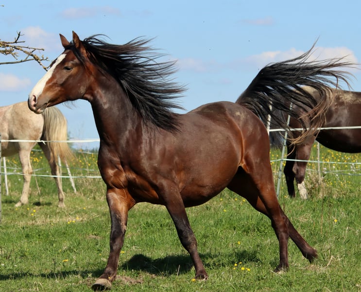 Unser Scotty zählt jetzt offiziell zu den 3-jährigen. Bis hierhin durfte er behütet, sozialisiert und verspielt in unserer Herde aufwachsen. Erst zusammen mit Bruder und Vater, nach der Kastration dann mit der Damenherde, in die er sich perfekt integriert hat und als "großer Bruder" auf die kleinen Schwestern aufpasst. Er zeigt überhaupt kein Hengstverhalten. Springt weder auf noch treibt er. Kann also völlig entspannt in jede Damen-WG mit einziehen. Scotty hat schon einiges an Training, bis hin zum Ausflug als Handpferd ins Gelände. Er ist wissbegierig und versteht neue Herausforderungen schnell. Er liebt es, wenn er was machen darf oder auch nur dabei sein kann. Ein absoluter Schmusebär, der viel Potenzial in sich trägt, denn träge ist er nicht. Er zeigt immer wieder gern, welche Balance in ihm steckt, auch bei wilden Manövern auf der Weide. Im Gelände ist er absolut trittsicher. Scotty hat gute Muskelanlagen und wird mit dem richtigen Training ein sehr kräftiges Pferd werden. Wer also im Frühjahr mit einem Jungpferd starten möchte, der hat hier viel Möglichkeiten, denn mit Morgans sind bekannt für ihre Vielseitigkeit. Mutter und Bruder können bei uns besichtigt werden. Vater wohnt mittlerweile als Deckhengst ist Frankreich. Zwei Halbschwestern sind auch noch bei uns und können angeschaut werden. Wir reiten unserer Pferde in der altkalifornischen Reitweise und bilden mit Bosal aus. In diesem Bereich sehen wir auch seine Stärke. Mit seiner wunderschönen Halsung, den butterweichen Gängen und einer tollen Versammlungsfähigkeit ist er aber natürlich nicht nur in diesem Bereich einsetzbar. Es steht fast alles offen mit diesem Compadre. Natürlich hat er einen Equidenpass, volles US-Papier, ist geimpft und entwurmt und regelmäßig dem Schmied vorgestellt.