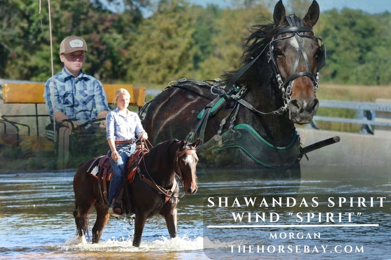 Meet Spirit he is a registered Morgan gelding that both rides & drives! His registered name is Shwandas Spirit Wind we just call him Spirit although he is the opposite of his name. He’s defiantly more WHOA than go. He has a quieter disposition for a Morgan he acts more like a quarter horse sometimes. He stands at 14.3 1/2 hands tall to be exact so he’s just under 15 hands but he has a very nice stout chunky build and can easily carry a bigger rider or pull a heavier load. For driving he is what I would consider beginner safe. He’s the horse I would want to teach beginners how to drive. He never misses a beat and doesn’t do a thing wrong. He has a been there done that attitude. He stands excellent for hitching, getting on/off the cart, stop lights, and I’m pretty sure he can read stop signs. He is great with the traffic as you can see in his video, he’s fine with all sorts of traffic from motorcycles up to semis. And in most of the video of him driving he has a 12yr old driving him. So, if you can’t drive Spirit, you really shouldn’t be driving any horse. We have used him to go into town to the store and back and he has always been perfect and easy to handle. He’s easy on the lines knows how to turn tight turns side passing in the cart if needed. He knows the words easy, whoa, walk on, trot, and back. He’s so good that when we get back from town what we normally do is just let him stand not tied while we unhitch. Then we take all of his driving gear off and the headstall last. And then without a halter he follows me back to his pasture. He’s just that good that’s how much I trust this guy. And for riding he’s just as good he stands good for mounting. Loads right in the trailer and backs right out. He’ll ride away from home alone, separate out on the trail, or stay walking if the other horse leaves him. He is a pretty easy going guy has a steady attitude. He has an easy to post to trot and a smooth easy to sit canter. He goes right in the creeks, rivers, or lakes. He can tackle the steep banks and hills no problems. He will cross bridges and logs. He is NOT easily flustered. As you’ll see in his video he didn’t care a bit about the fire, and he’s quite used to the dog running all around his legs so he’s great with dogs. He is the farriers favorite he stands that good and so good he gets the hot shoes! He gets along out in the pasture I would say he is the middle of the pecking order. He’s an easy keeper NO maintenance required. NO bad habits. He’s friendly and easy to catch. He’s pretty easy to get along with and I forget sometimes that he’s only 5 yrs old. He has an old soul. So if he’s this good at 5yrs old he can only get better over time. He comes up to date on vaccines, dewormings, farrier, vet check, and coggins. Just call to set up a time to come see him in person or with any questions.