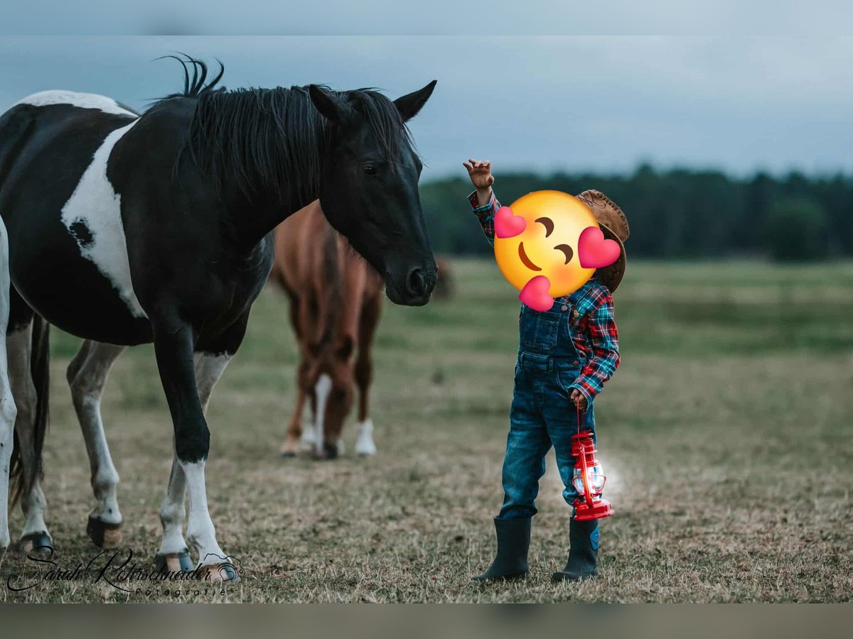 Straits Poco Sue - eine bildhübsche Paint Horse Stute, geboren 2016, mit einem Stockmaß von ca. 154 cm. Sie besticht durch ihre außergewöhnlich schöne black tobiano-Färbung, ist homozygot tobiano und besitzt ein korrektes, kompaktes Fundament. Charakterlich ist sie ein echter Schatz - ruhig, liebevoll und sehr menschenbezogen. Im Umgang zeigt sie sich stets freundlich und bemüht, alles richtig zu machen. Sie wirkt fast wie ein Kinderpony, da sie so gelassen ist und auch im Schritt und Trab problemlos von Kindern geritten werden kann. Sue wurde von einer Jugendlichen geritten und hat eine solide Westernausbildung. Sie ist geländesicher und zeigt sich unter dem Sattel aufmerksam und lernwillig. Im Galopp kann sie vor Freude hin und wieder einen kleinen Buckler zeigen, weshalb sie einen Reiter braucht, der konsequent, aber feinfühlig mit ihr umgeht. Wird sie korrekt gearbeitet, zeigt sie sich auch in der Gangart brav und kooperativ. Leider ist sie zurzeit nicht ausgelastet. Sie ist gesund, regelmäßig entwurmt, brav beim Tierarzt und Hufschmied und kennt sowohl Offenstall - als auch Boxenhaltung. Ihre Zuchtqualitäten sind ebenfalls hervorzuheben: Sie stammt aus einer guten Paint Horse Linie, war bereits Mutter und hat problemlos aufgenommen sowie ohne Komplikationen gefohlt. Ihre Nachzucht war stets korrekt und vielversprechend. Da leider die Zeit fehlt, ihr gerecht zu werden, wird für diese tolle, liebe Stute ein neues, wertschätzendes Zuhause gesucht - sei es in der Zucht, im Freizeitbereich oder beidem. Straits Poco Sue bringt alles mit, was man sich von einer zuverlässigen, freundlichen Partnerin wünscht.