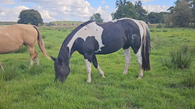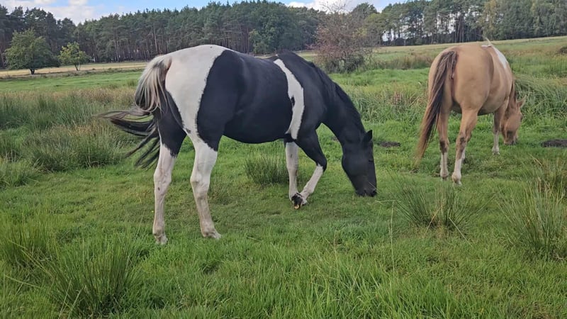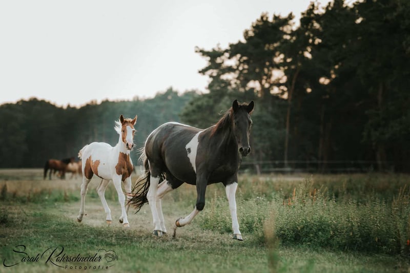 Straits Poco Sue - eine bildhübsche Paint Horse Stute, geboren 2016, mit einem Stockmaß von ca. 154 cm. Sie besticht durch ihre außergewöhnlich schöne black tobiano-Färbung, ist homozygot tobiano und besitzt ein korrektes, kompaktes Fundament. Charakterlich ist sie ein echter Schatz - ruhig, liebevoll und sehr menschenbezogen. Im Umgang zeigt sie sich stets freundlich und bemüht, alles richtig zu machen. Sie wirkt fast wie ein Kinderpony, da sie so gelassen ist und auch im Schritt und Trab problemlos von Kindern geritten werden kann. Sue wurde von einer Jugendlichen geritten und hat eine solide Westernausbildung. Sie ist geländesicher und zeigt sich unter dem Sattel aufmerksam und lernwillig. Im Galopp kann sie vor Freude hin und wieder einen kleinen Buckler zeigen, weshalb sie einen Reiter braucht, der konsequent, aber feinfühlig mit ihr umgeht. Wird sie korrekt gearbeitet, zeigt sie sich auch in der Gangart brav und kooperativ. Leider ist sie zurzeit nicht ausgelastet. Sie ist gesund, regelmäßig entwurmt, brav beim Tierarzt und Hufschmied und kennt sowohl Offenstall - als auch Boxenhaltung. Ihre Zuchtqualitäten sind ebenfalls hervorzuheben: Sie stammt aus einer guten Paint Horse Linie, war bereits Mutter und hat problemlos aufgenommen sowie ohne Komplikationen gefohlt. Ihre Nachzucht war stets korrekt und vielversprechend. Da leider die Zeit fehlt, ihr gerecht zu werden, wird für diese tolle, liebe Stute ein neues, wertschätzendes Zuhause gesucht - sei es in der Zucht, im Freizeitbereich oder beidem. Straits Poco Sue bringt alles mit, was man sich von einer zuverlässigen, freundlichen Partnerin wünscht.