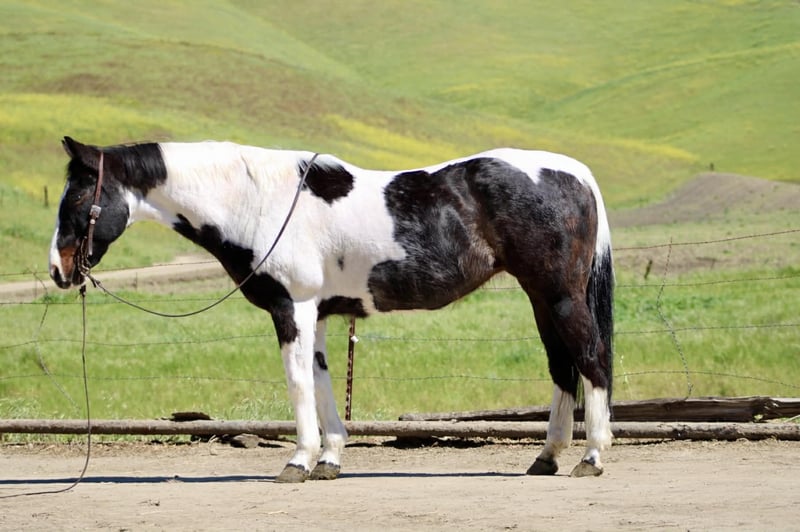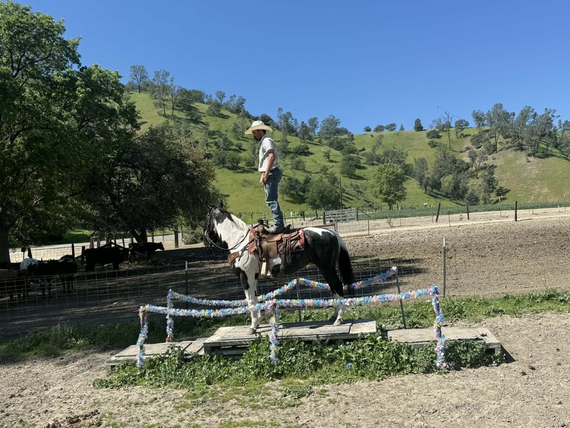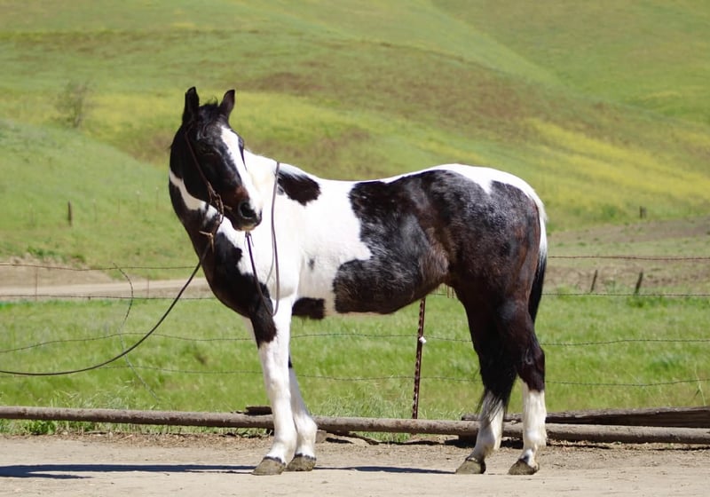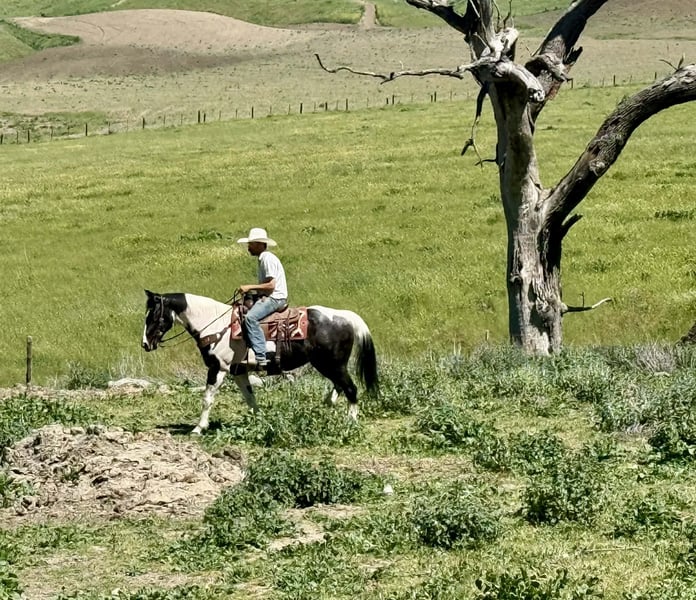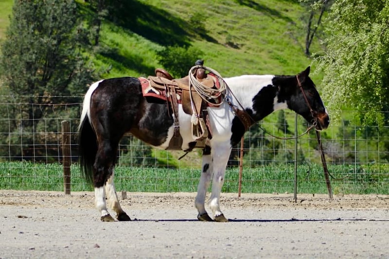 "AVAILABLE ON ONLINE HORSE AUCTION AT www DOT PlatinumEquineAuction DOT com BIDDING OPEN NOW thru SUNDAY | APRIL 5TH! *Final price will be determined on auction site* CONSIGNOR CONTACT INFO: Longhorn Ranch 831-537-1915 LOCATION: Paicines, CA BILLIE 13-Year-Old Black & White Paint Mare • 14.3 Hands Handy • Broke • and beautiful Not too big. Not too much. Not too little either. Billie lands right in that sweet spot. She’s 14.3 hands of handy, easy-to-get-along-with kind of horse — the kind you can step on without a second thought and just go enjoy your ride. But don’t mistake easy for dull… This mare will travel. Billie has a natural steady way of going that makes her a pleasure out on the trail. She’ll cover ground without being pushed, move out with purpose, and still stay right there with you. She’s not lazy, not over-the-top — just a good, honest “in-between” that makes sense. Point her out across country and she goes to work. Brush, hills, rough ground, water — she handles it without hesitation and keeps a steady rhythm the whole way. She’s the kind you can actually go get something done on… or just go somewhere and enjoy it. Around town, she’s just as solid. Traffic, noise, commotion — she takes it in stride and stays level-headed. Obstacles? Not worth mentioning. Bridges, tarps, flags — she walks through it like it’s part of the job. On the ranch, Billie knows her way around a day’s work. She’s been used to rope and brand on, is confident around cattle, and has a natural feel for her job. Sorting, gathering, or just covering ground — she’s useful without being complicated. And when you’re done… She’s easy to live with. Quiet to saddle. Stands tied. Hauls well. Gets along wherever you put her. No babysitting. No overthinking. No surprises. Just a good-feeling, good-minded mare that shows up the same every time and makes riding enjoyable. She’s the kind that doesn’t wear you out… but still gets you where you’re going. If you’re looking for a handy-sized mare that’s broke, useful, and covers country with ease — Billie is one you’ll appreciate every ride. Paicines, California Longhorn Ranch call or text Dina 831-537-1915 Nationwide shipping available
