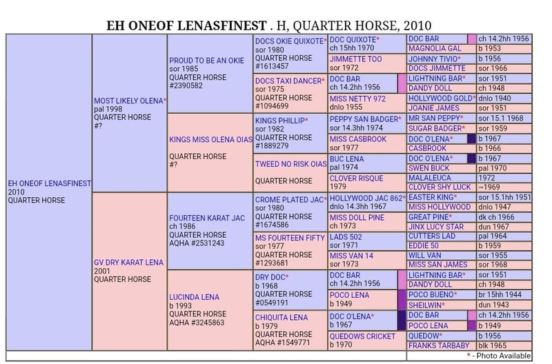 Mutter und Vater gehen zurück auf Doc Bar dessen Nachkommen in den Disziplinen Reining, Barrel Racing und Halter laufen und erfolgreich sind.
