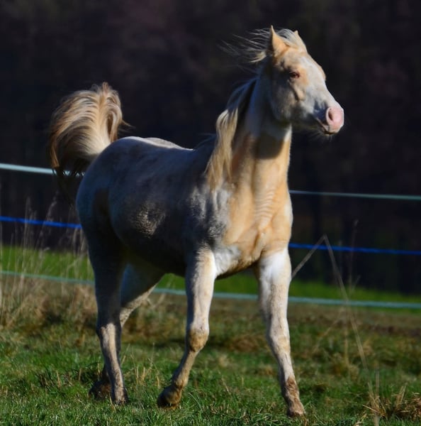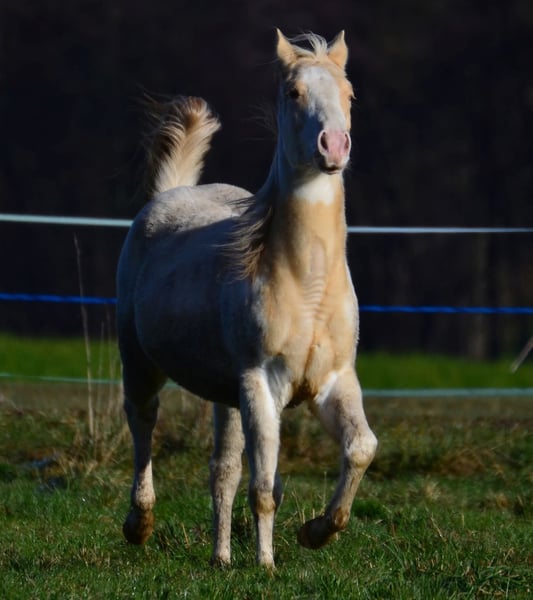 Brezel is homozygous for Tobiano and Champagne! Her foals will always be colorful and Champagne colors. She herself is a Gold Champagne pinto. Of course also 7 panel N/N. She gets passport and papers from the APHA and PHCG. Brezel has a blue eye. She is a little heartbreaker who really demands to be scratched.