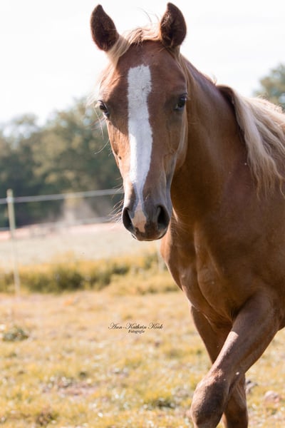 Peach is a typical mare with a long flaxen mane and ticked hairs. She is growing up well-socialized in a mare herd. She is familiar with trailer loading, farrier work, and is regularly dewormed. She comes from excellent parents; her father is Mc Oleaner (among others, a 4-time Futurity winner NRHA, 2-time Derby winner), and her mother is the full sister of the successfully shown Doctors Diamond (Grischa Ludwig).