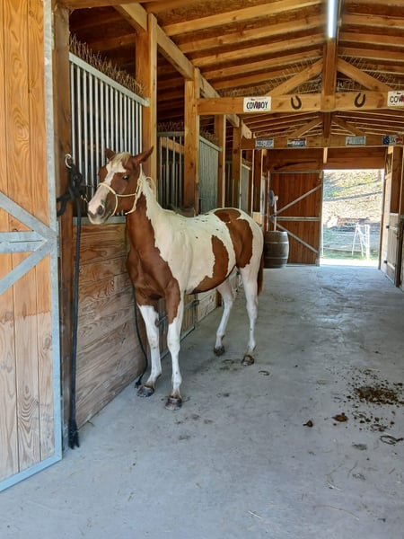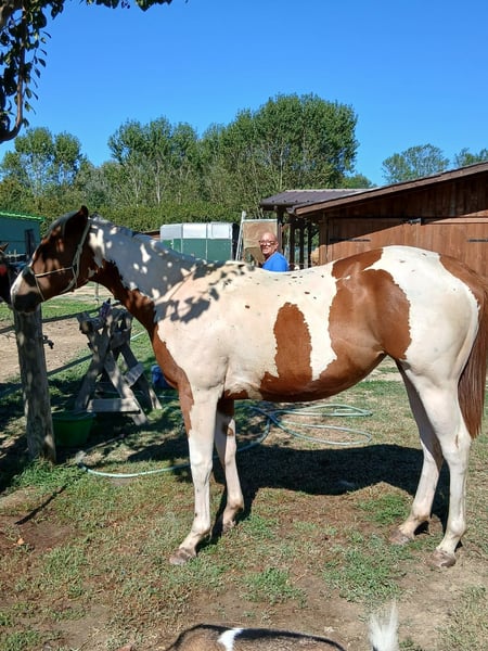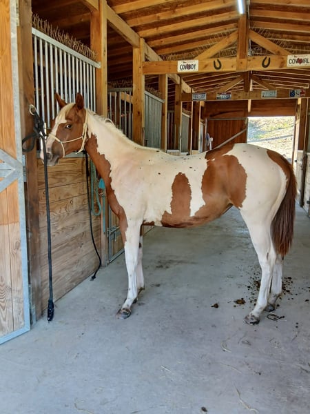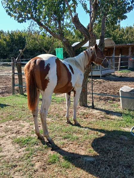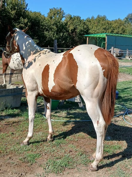 Beautiful paint filly, sorrel tobiano, 16 months old Cutting line (Peptoboonsmal, Freckles Playboy, 2xPeppy San Badger…) Excellent structure We are in the province of Asti For information, contact by phone or WhatsApp Gaetano 3472513702