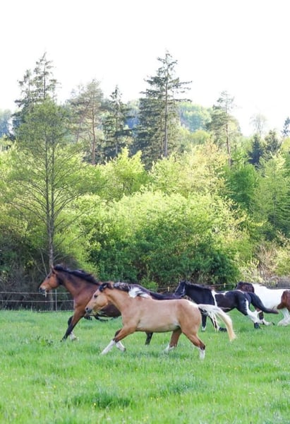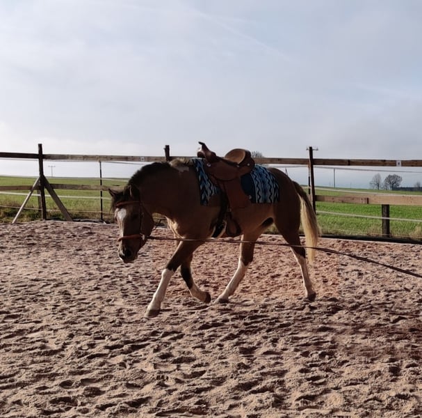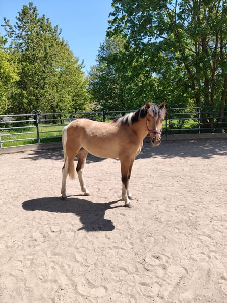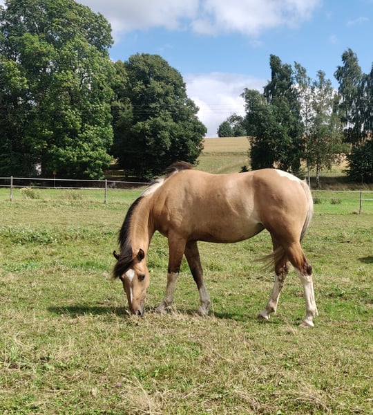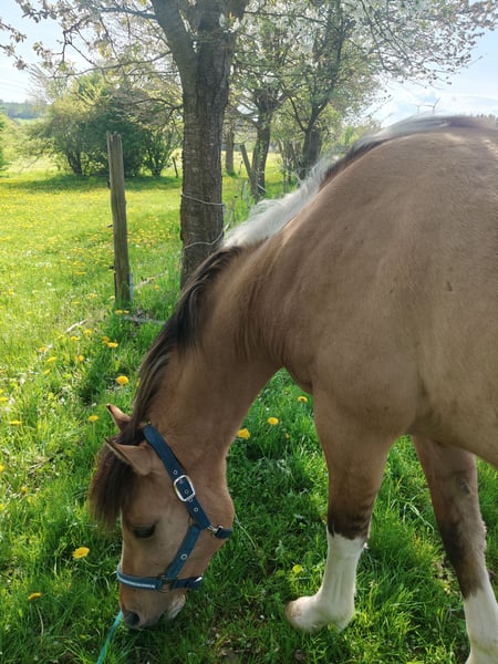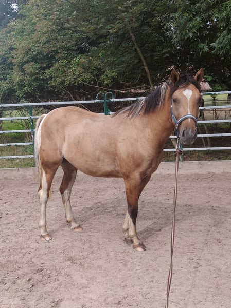 Junge, sehr entspannte Buckskin-Paint-Stute sucht fördernde, liebevolle Hände. Die Kleine kennt Bodenarbeit, kleine Tricks wie Hinlegen, Sattel, gebisslose Zäumung und ist komplett fürs Anreiten vorbereitet. Auf- und Absteigen macht sie schon ganz lieb. Bei Spaziergängen zeigt sie sich neugierig und unerschrocken. Im Umgang lieb und menschenbezogen, kennt Hänger fahren, ist geimpft und regelmäßig bei der Hufpflege. Robust im Herdenverband aufgewachsen. Fala wird mal ein super liebes Reitpferd und später sicher auch mal für Familien, Kinder, Anfänger interessant. Zuerst braucht sie noch einen erfahrenen Reiter/ Trainer. Vater: der wunderschöne Grullo- Hengst EMH Paints PepsHonani. Wir wünschen uns für die kleine Maus fördernde, liebevolle Hände.