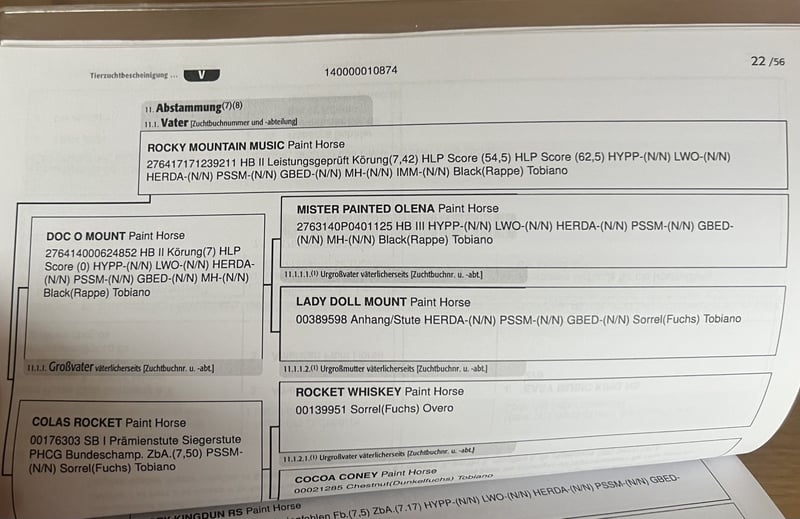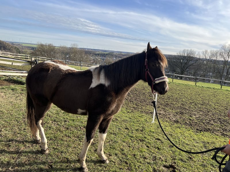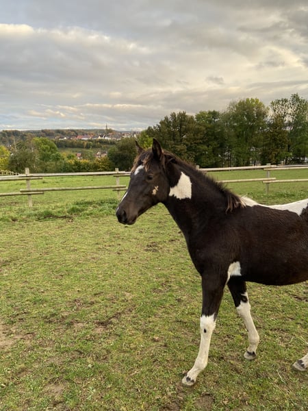Zum Verkauf steht unsere wunderschöne Paint Horse Stute Easy Music King RS, liebevoll „Elsa“ genannt. Farbe Smoky Black Tobiano Elsa überzeugt nicht nur durch ihre tolle Zeichnung, sondern vor allem durch ihr ausgeglichenes und freundliches Wesen. Sie ist sehr lieb im Umgang, halfterführig und zeigt sich stets entspannt und menschenbezogen. In der gemischten Herde ist sie rangniedrig und absolut verträglich. Sie steht aktuell im Offenstall und ist diese Haltungsform bestens gewohnt. Regelmäßige Entwurmung ist selbstverständlich erfolgt, zudem kennt sie die Hufbearbeitung und verhält sich dabei brav. Abstammung: Vater: Rocky Mountain Music Mutter: Ivory Kingdun RS Informationen: • Rasse: Paint Horse (APHA) • Geschätztes Endmaß: ca. 155 cm (anhand der Vollgeschwister geschätzt) • 5-Panel-Test: N/N • OLWS: N/N • MHYM: N/N • APHA-Papiere vorhanden • E-Pass vom PHCG Elsa ist eine tolle, entspannte Jungstute mit bester Abstammung und einem klaren Kopf – ideal für Freizeit, weitere Ausbildung oder Zucht. Bei ernsthaftem Interesse freuen wir uns über eine Nachricht