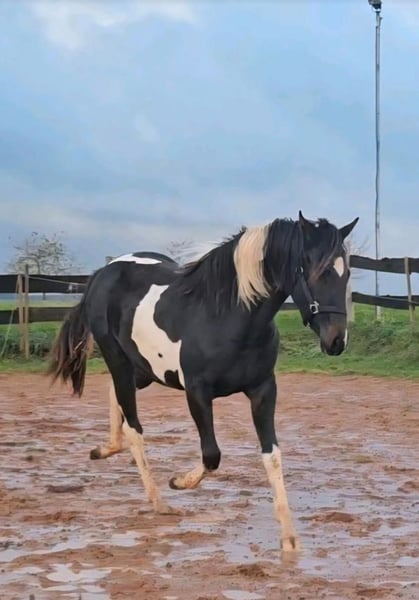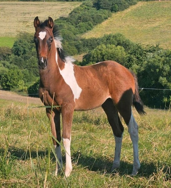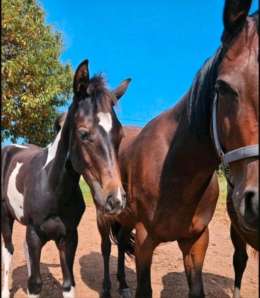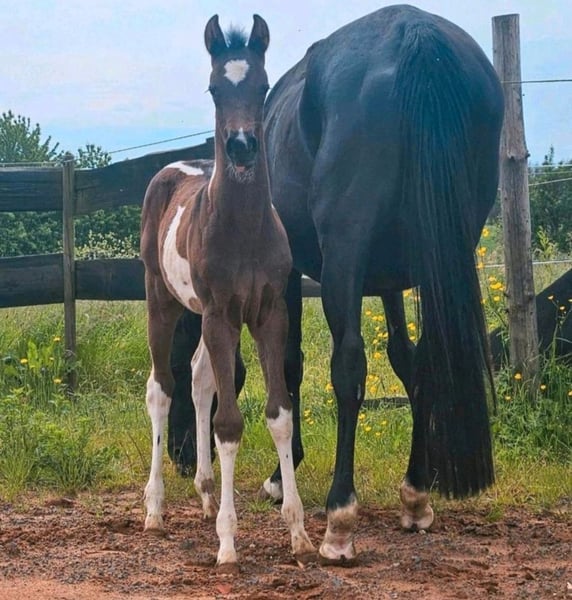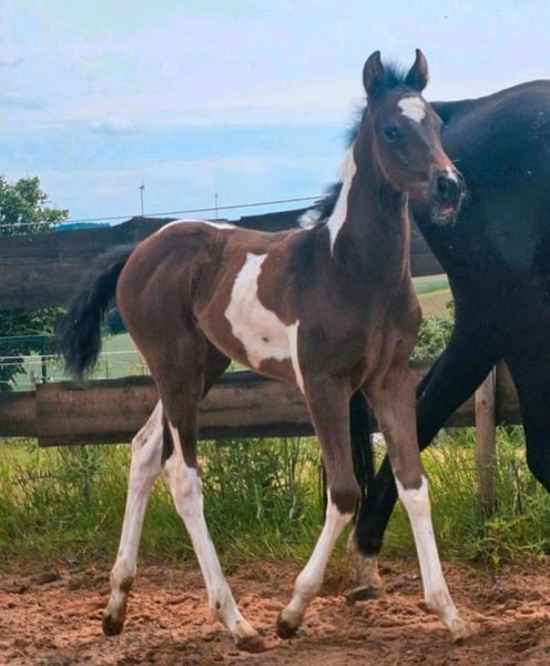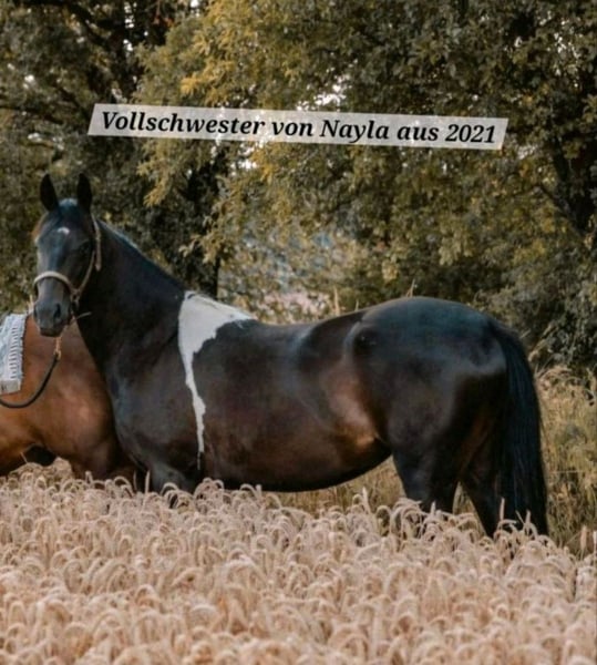 Vor dem Sommer zum Sonderpreis: Apaches Nayla Bar, American Painthorse-Stute. Nayla (=indianisch: Ich liebe dich), geboren am 27.04.2024, von Apaches Lightning Bar (durch seine Adern fließt feinstes Cowhorse-und Foundation-Blut), aus der Morning run. Wunderschön gezeichnet, korrekt und großrahmig gebaut. Beide Elterntiere absolut rittig und charakterlich einwandfrei. Nayla wächst in Robusthaltung auf, steht in gemischter Herde, im Sommer 24/7 auf Weide. Selbstverständlich wird sie regelmäßig entwurmt und geimpft abgegeben. Die Nachkommen unseres Hengstes zeichnen sich durch eine sehr menschenbezogene Art aus. Papiere von der American Painthorse Association und Equidenpass ausgestellt vom Painthorse-Club Germany. 7-Panel vorliegend.