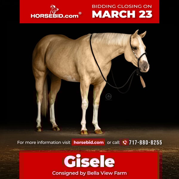 ⚜️𝓽𝓱𝓮 𝐆𝐎𝐋𝐃 𝓢𝓮𝓵𝓮𝓬𝓽⚜️ Happening now thru MONDAY | MARCH 23rd - Available EXCLUSIVELY on HorseBid's website! For more details and to register visit: www.Horsebid.com CONSIGNOR CONTACT: Bella View Farm 717-880-8255 LOCATION: Grantville, PA BREED: APHA REGISTERED: Yes REGISTERED NAME: CMONBARBIE LETSGOPRTY COLOR: Palomino HEIGHT: 15 AGE: 3 GENDER: Mare If you ever wanted your own Barbie dream horse here’s your chance, our girl “CMONBARBIE LETSGOPRTY” lovingly known as Gisele will not disappoint!!! 2023 APHA Palomino Mare. 5 panel negative by parentage. Currently 15 hands but still has some growing left to do And very BIG bodied!! Don’t let her age fool you Gisele is an old soul who’s always down for new adventures!! She he is SMART and a super quick learner, always aims to please. She Rides English and western, Has been ridden in the arena & out on trails. Even her first time out on the trails she didn’t bat an eye at anything!! Braver than most seasoned trail horses and she LOVES it!! Will go through deep water, under power line towers, steep inclines and declines, road safe also!! Been exposed to cows too. Excellent ground manners, trailers perfect, w/t/c with a big stop. Rides well alone or with company, Sides passes, open gates and doors off her, Heck she’s been pulling skiers this winter!! ⛷️😎 Gisele is very adjustable to her rider she’s happy to go slow or fast whatever speed you ask for. Has been hauled to shows and shown in halter. Settles in great no matter where you take her whether to a show, clinic or group trail ride!! Gisele has full siblings out showing and doing fantastic & I have no doubt she will be the same. Her sire “Dirty Callahan” is very versatile himself and his offspring excel at being true all around horses inside and outside of the show ring!! Whether your looking for your next show horse or forever trail horse we think you’ll fall in love with Gisele!! Does NOT need a 7 day a week program, currently being ridden twice a week and is still sane and progressing nicely with every ride. Giselle is exactly what my program strives to find and sell versatile horses that can exceed in multiple disciplines and above all else have an excellent brain!! 100% Sound & and has always been Barefoot!! No maintenance. Feel free to call or text with any questions or to set up a time to come see her!! Heidi Albright (717)880-8255