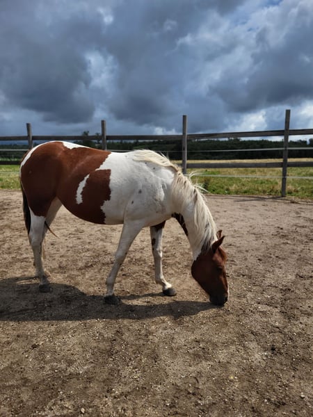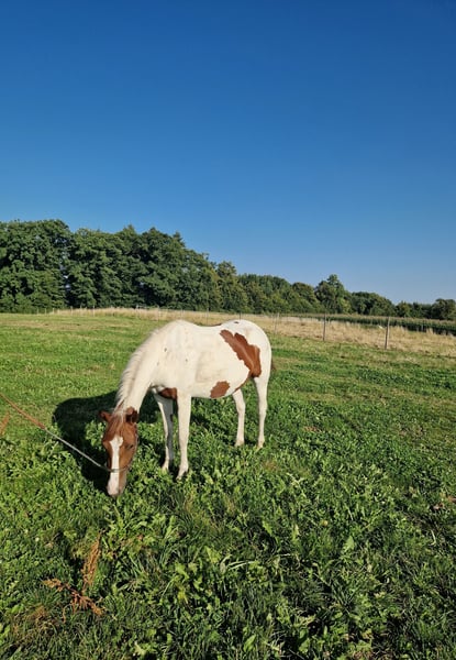 Szukamy 5-gwiazdkowego domu dla naszej "Phoebe". Słodka klacz rasy Paint (ur. 2023) ujrzała z nami światło dzienne. Jej rodzice również są na naszej farmie: Matka: Indiana Ojciec: Zippos King Bar Jej pełną siostrę z 2024 roku również można zobaczyć na naszej farmie. Phoebe ma wszystko, czego można sobie życzyć: Silna, poprawnej budowy, absolutnie nieustraszona, bardzo lubiąca ludzi i zawsze otwarta na nowe rzeczy. Nauczyła się wszystkiego, co trzeba wiedzieć w tym wieku: Przycinanie kopyt, prezentacja przed kowalem, pielęgnacja, prysznic/mycie, chodzenie/prowadzenie. Phoebe ma wszystkie podstawowe szczepienia i jest regularnie odrobaczana. Posiada paszport konia. Obecnie jest wychowywana z innymi młodymi końmi. Może zostać tutaj w celu dalszego wychowania lub przenieść się do nowego domu. Jeśli chcesz poznać Phoebe, po prostu napisz do nas.