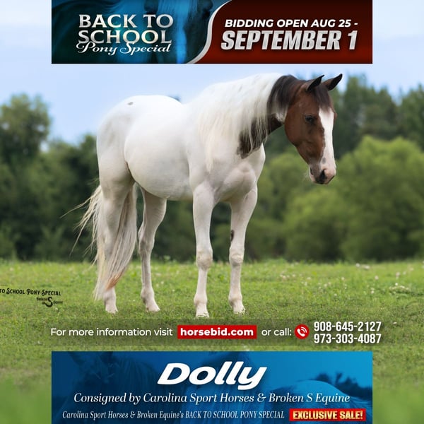 𝐂𝐚𝐫𝐨𝐥𝐢𝐧𝐚 𝐒𝐩𝐨𝐫𝐭 𝐇𝐨𝐫𝐬𝐞𝐬 & 𝐁𝐫𝐨𝐤𝐞𝐧 𝐒 𝐄𝐪𝐮𝐢𝐧𝐞'𝐬 📚𝑩𝒂𝒄𝒌 𝒕𝒐 𝑺𝒄𝒉𝒐𝒐𝒍 𝑷𝑶𝑵𝒀 𝑺𝒑𝒆𝒄𝒊𝒂𝒍📚 Happening now thru MONDAY | SEPTEMBER 1st - Available EXCLUSIVELY on HorseBid's website! For more details and to register visit: www.Horsebid.com CONSIGNOR CONTACT: Carolina Sport Horses & Broken S Equine Kieran 908-645-2127 or Beau 573-303-4087 LOCATION: Clover, SC BREED: Paint REGISTERED: No COLOR: Paint HEIGHT: 13.2 AGE: 4 GENDER: Mare Dolly is a 4 year old paint mare standing 13.2 hands high. She has the moves and talent to shine in the show ring, and the quiet nature for absolutely anyone to enjoy. Talk about an unflappable horse, Dolly will stand still as a statue with bull whips being cracked, fireworks, and gunshots. She was born with a quiet mind, always being a slow and steady type. She’s ridden out with cows, gone cross country, enjoyed hunter paces, and of course has trail ridden on all over the countryside. She’s big enough in the body for adults, and gentle for the smallest riders too! Whether you want a future partner for the show ring, or a gentle and safe horse that anyone can take out on the trails today, Dolly is your girl! In the ring, Dolly has three comfortable and steady gaits. She picks up both leads, has a nice stop, and is easy for anyone. This mare is so gentle, we trust can trust her with anyone. Going off property to school in new, spooky, places was a breeze with her. She doesn’t get worked up a bit, and treats every new place like it’s home. On the trails, Dolly is steady and relaxed. She loves trail riding and hacking out. The kids can safely take her out alone, and she’s happy to go wherever you point her. She is safe in traffic, will cross water, and is the same quiet horse on any terrain. In the barn, Dolly is sweet and kind. She loves attention! She’s polite, yet affectionate, and gets along well with her people. She lives outside in a mixed herd of mates and geldings, and is an easy keeper with no vices or maintenance. Clean recent vet check on file