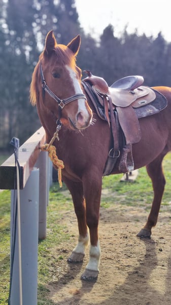 Zum Verkauf steht eine hübsche, großrahmige American Paint Horse Stute, geboren am 27.04.2022, in der Farbe Chestnut, mit amerikanischen Papieren. Foxy wurde bisher vom Boden aus nach Natural Horsemanship gearbeitet und ist bereits gut vorbereitet für ihre weitere Ausbildung. Sie ist an Sattel, Zaumzeug und Reitergewicht gewöhnt, wurde aber noch nicht geritten. Foxy kennt die Arbeit vom Boden und zeigt sich dabei lernwillig und aufmerksam. Sie ist zudem verladefromm und fährt brav im Hänger. Sie war bereits auf mehreren Wochenendkursen dabei und kennt sowohl Offenstall als auch Boxenhaltung. Foxy ist selbstverständlich brav beim Schmied (regelmäßig beschlagen). Aufgrund ihres Alters und Ausbildungsstandes ist sie nicht für Anfänger oder Kinder geeignet. Sie sucht einen erfahrenen Menschen, der sie weiter fördert und ausbildet. Die Stute wird aus Zeitmangel verkauft!