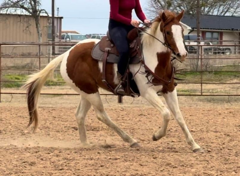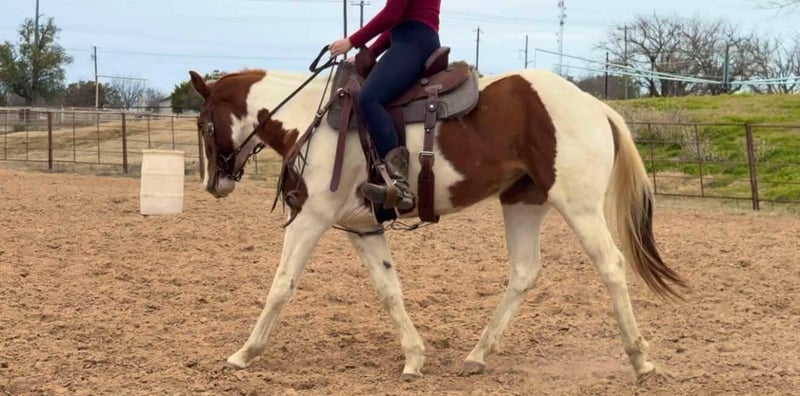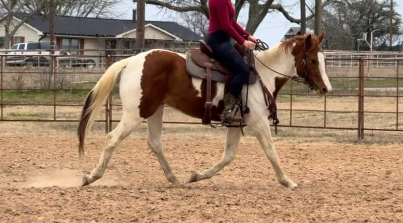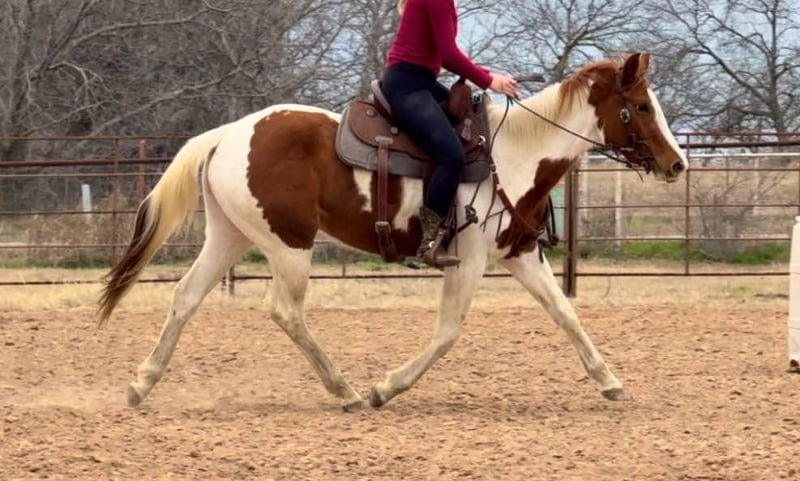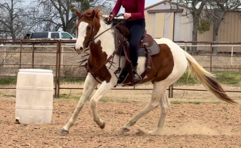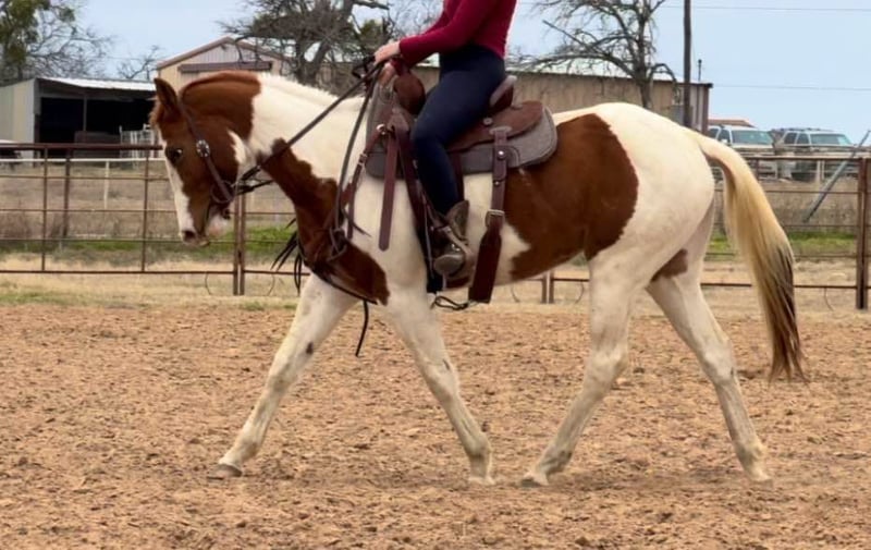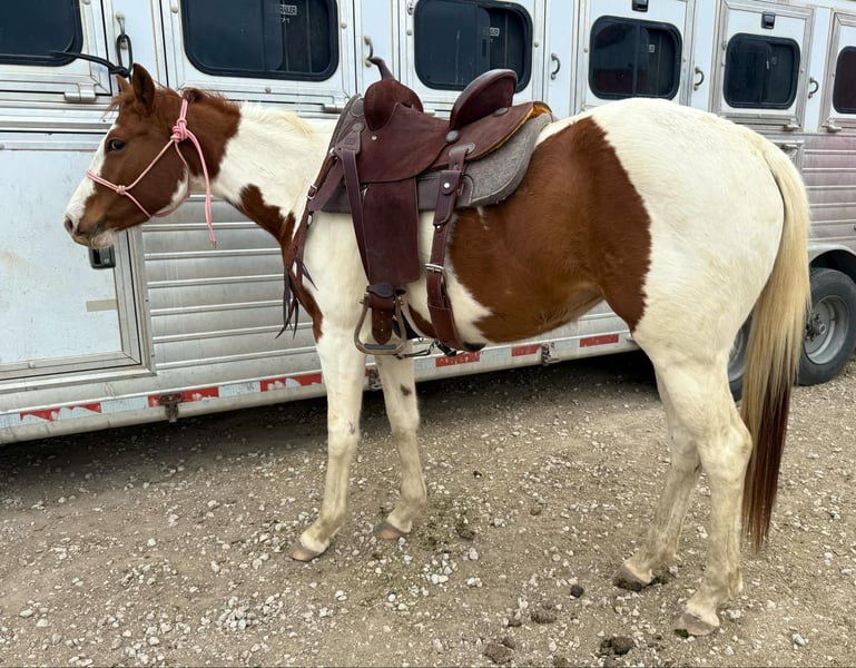 ONLINE AUCTION Place your bids at www.PlatinumEquineAuction.com Starting Bid $3500 Auction ends February 23rd, 2025 Need a new saddle? Check out White Rock Saddles on our website or Facebook! Bunny is a 14.3H, insanely GENTLE 3 yr old paint mare. We’ve been holding this filly as a personal prospect, but she’s just too personable and kind, it’s not fair for her to not be someone’s number one! This young prospect can go in absolutely ANY direction. She is so gentle, a kid could go on with her as she is now! Bunny has already seen more than most horses triple her age. She’s been roped on in the pasture, seen countless miles of pasture and trails and she’s even very lightly been started on the barrel pattern. She is so sweet and absolutely so willing. She has ZERO buck, bolt or rear and is one of the easiest babies we’ve ever had the pleasure to work with. We typically don’t represent anything thing young, but she is an exception to our rule because she is so incredibly gentle and safe! Bunny is a stellar prospect and the best part is, she’s safe enough for the novice rider too! She’ll make anything from a rope horse to a barrel horse or even kids playday horse! If all you desire is trails, saddle her up tomorrow and go! Bunny rides good, neck reins, direct reins, moves off leg and naturally has a big stop! She is quiet and well mannered in all aspects. She stalls or turns out well and will walk right up to you on 100 acres. She absolutely LOVES attention and wants to be your best friend. There isn’t a thing we don’t like about this filly! She loads, leads, bathes, and ties great too! Bunny is UTD on teeth, feet and coggins and ready to go be someone’s number one! More pics and videos on her website page at northtexashorsecompany.com/bunny. Please call Blair with North Texas Horse Company for more info at 817-757-3046. We are located in Weatherford, TX and can help arrange affordable shipping to anyone!! ONLINE AUCTION Place your bids at www.PlatinumEquineAuction.com Starting Bid $3500 Auction ends February 23rd, 2025 Need a new saddle? Check out White Rock Saddles on our website or Facebook!