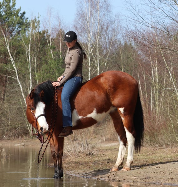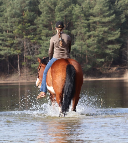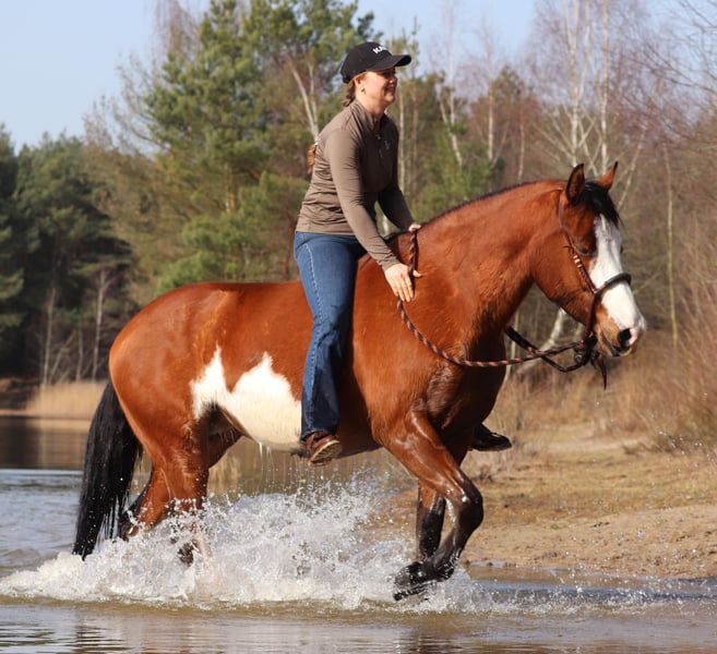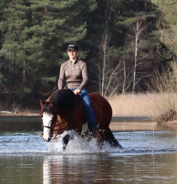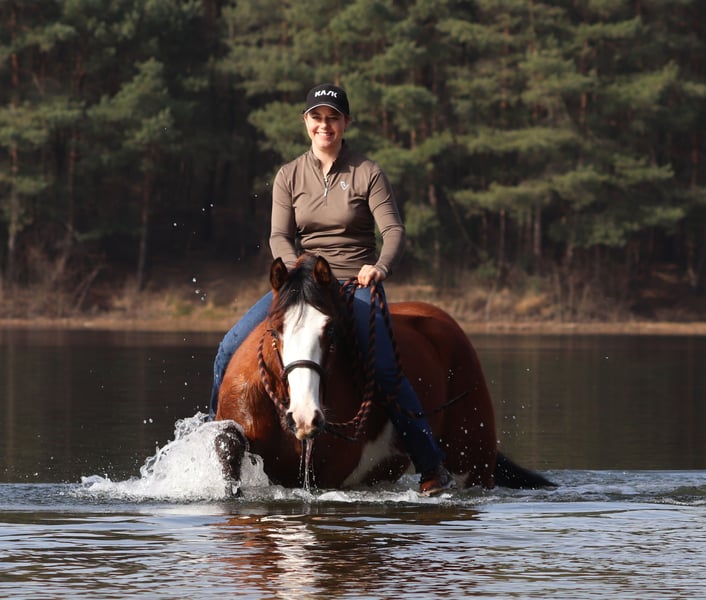 Lee is a true beauty – a young, affectionate mare with a very special character that captivates you from the very first moment. With a height of approximately 15.3 hh, she has an ideal size and offers everything one could wish for in a heart horse, both visually and in character. She is not only a real eye-catcher but also, despite her young age, reliable in all three basic gaits when ridden by us. Lee consistently demonstrates motivation, sensitivity, and attentiveness. As a future leisure partner, she is perfect for riders seeking a trustworthy and versatile companion – whether for Western riding, working equitation, or relaxed rides through woods and fields. Talented and simply fun to ride, Lee is a horse with whom you can grow together and share many wonderful moments. What sets Lee apart even more is her tremendous willingness to learn. She is a true “model student” – curious, attentive, and always open to new experiences. Especially in liberty work and the art of horsemanship, she shows great sensitivity and strives to do everything correctly. Her honest, people-oriented nature makes her a wonderful partner with whom work is never dull. Lee is a genuine all-rounder and up for any fun. She particularly loves being out in nature. Whether at the lake or on extensive forest rides, she has always shown herself to be relaxed and content. Whether alone or in a group, every ride with Lee is a beautiful experience. Her soft, comfortable gaits make riding especially pleasant, and she is a joy to sit. In everyday life, she impresses with her attentive yet balanced personality. Noise, playing children, or passing cars hardly affect her – she remains calm and confident. Her loving manner with people and her remarkable light-footedness make her a true treasure. Lee is more than just a horse – she is a loyal friend who inspires anew every day. We only wish for her to be in the very best hands, where she will continue to be supported, trusted, and able to develop positively. If you have a heart for special horses and want to share many adventures with Lee, she might be the perfect partner for you. We want to give her a home where she feels completely comfortable and continues to receive the love and attention she knows. Therefore, she will only be placed in good hands. By arrangement, we are happy to personally deliver her to her new stable for a small travel fee. An ultrasound examination can be performed upon request. You can find us in 26899 Rhede. We are happy to share the exact address after a personal conversation. You can reach us by phone at 0162 4348386. We take plenty of time for introductions and trial riding, ensuring everything happens calmly and without pressure. To ensure that only genuinely interested persons contact us and that it doesn’t turn into a weekend trip, we charge a service fee of €50, which will be fully credited toward the purchase price. Thank you very much for your understanding. 💛