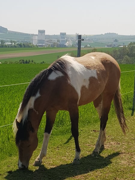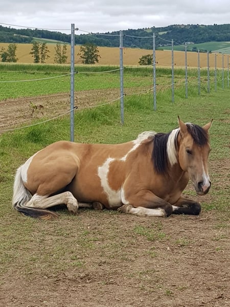 Magnifique jument Paint de 4 ans dans la couleur de rêve, Buckskin Tabiano ! Père : True Doc Cherokee Non dressée, à finir d’éduquer soi-même ! Travaillée à pied !