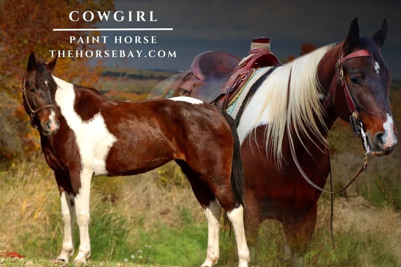 STOP and check her out!!! Cowgirl is a 4-year-old Paint mare with an old soul. She is very broke, more so than many horses twice her age. She ranches, is a trail machine, and even knows some tricks. She stands at 14.3 hands tall but may grow another inch or two yet. So, check out her video and read her full description —you won’t want to miss out on her; she is a real Cowgirl. Cowgirl is a handy horse to have around. She’s the one who gets used to working cattle the most. She’s been used for roping and medicating calves. She’s roped a couple of bulls and held them as well. She’s level-headed and does NOT get flustered easily. She’s had the rope all over her, and it does not bother her a bit. She has had it under her tail and all around her legs. She can head or heel. She is the go-to horse to have around for roping and ranch work. She’s very handy broke. And she’s the one that gets used when teaching a new horse, the ropes, because you need a level-headed horse to stay calm if things go south. She knows how to move off your leg, shoulders, hindquarters, and sidepasses. Picks up her correct leads and has a good neck rein along with a nice stop off the seat. You can open and close gates off of her back. She hobbles as well. And she has been used to pony a string of horses. She has good ground manners. Stands still for tacking, mounting, and the farrier. She loads in the trailer, backs right out, and hauls good. For mounting, she knows the come over cue, whether you are on a mounting block or out in the woods on a log. Can’t find a stump or log, NO problem. Cowgirl knows the lay down cue and will lie down for you to get on. She can also lie down to get off as well. Out on the trail, she is excellent. She does NOT spook easily. She is fine riding with a dog. She is used to having her doggy friend come charging up behind her all the time. She’s fine with wildlife, too. She’s even had birds fly out of the brush next to her, and she didn’t bat an eye. She will cross water, such as a small creek or a big river. She will also cross little wooden bridges and logs. And she tackles big hills and steep banks with no problems, easily picking her way down. She has very smooth gaits as well, her trot is easy to post or sit to, and her canter is VERY smooth. Her demeanor is more laid-back and more SLOW than go. She has NO bad habits or vices. She is a safe mare with a level head on her shoulders and loads of experience under her cinch. She is this good at this age, imagine what she’ll be like in a few more years. She’s easily an all-around family type of horse that everyone can enjoy and will make a great forever horse for some lucky person. And as you can see in the video, she does great jumping, too. That was the first time that we asked her to go over a jump, and most horses can be a little clumsy the first time, and Cowgirl excelled. She has enough athletic ability and excels wherever you put her. I could easily see her doing great at 4-H, fun shows, giving lessons, or fox hunting. She’s very versatile and doesn’t get flustered easily, wherever you put her. She is excellent with traffic as well; she’s been ridden down busy highways with traffic zipping by, and she never gets bothered by it. She comes up to date on farrier, vaccines, dewormings, coggins, and a vet check. Cowgirl did have a small bump on her back right leg when I got her. It has never bothered her, but I had X-rays done on it to make sure it’s not something to worry about. And in the vet’s own words, it’s a blemish. It’ll always be there and does not affect her in any way. We also had a pre-purchase lameness exam, and she was found healthy with no lameness. And she’s been on 10-plus-mile trail rides and can also do a full day of roping cows, and NEVER gets sore.
