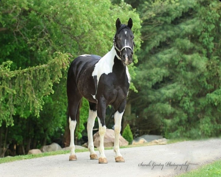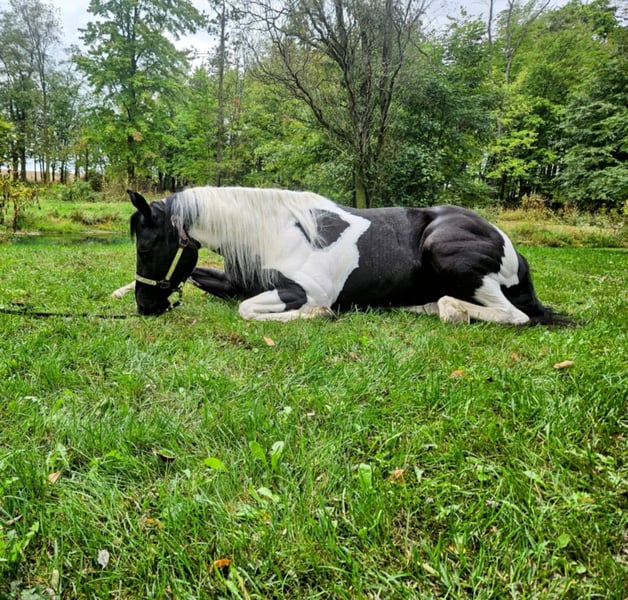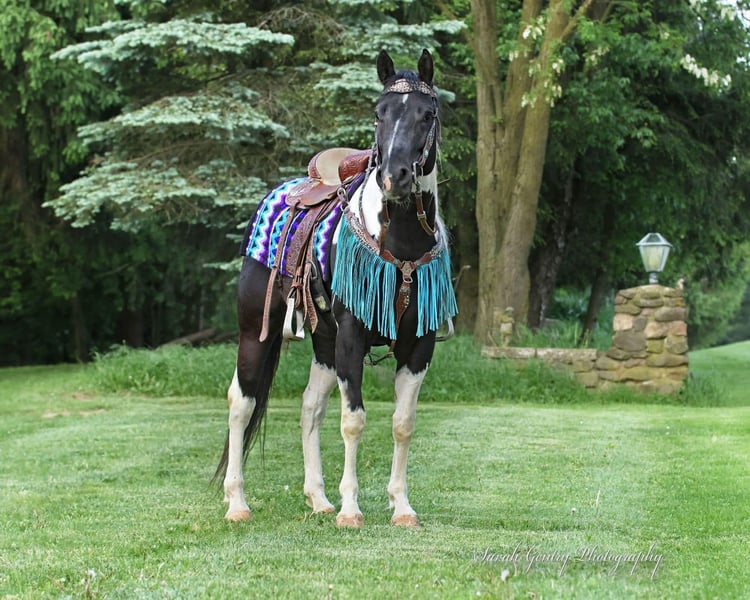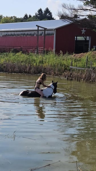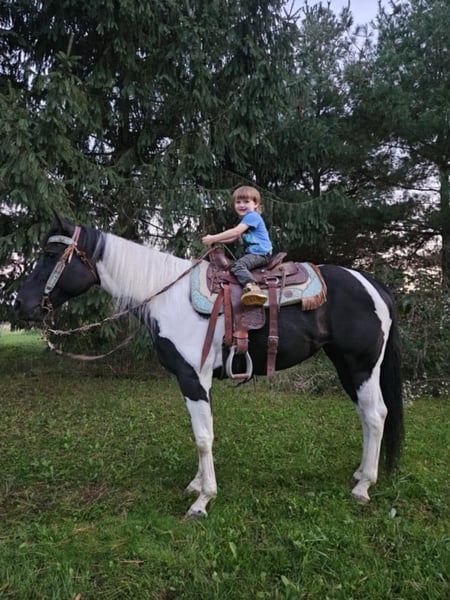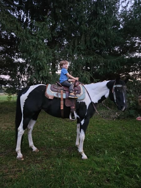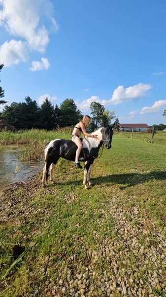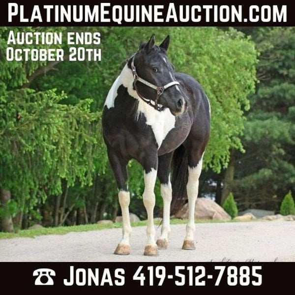ONLINE AUCTION Place your bids at www.PlatinumEquineAuction.com Starting Bid $3500 Auction ends October 20th, 2024 Need a new saddle? Check out White Rock Saddles on our website or Facebook! Breezin Tazzy Cat aka Sweet Pea is a 4 year old registered American Paint Horse with the kind of markings that never fail to turn heads anywhere that she goes. Taris Breezin Cat quickly earned her barn name (Sweet Pea) as she is truly one of the kindest, gentlest, and most willing mares that you will ever meet in your life, we can guarantee you that! Taris Breezin Cat aka Sweet Pea stands 14.2 hands high. Her sire is accomplished stallion Meradas Cat Alena and her grand sire is the one and only Cats Merada who boasts an overall LTE of 5 MILLION dollars! Sweet Peas dam is a 1D barrel horse that won her 2 year old futurity.(her dam was foaled in 1997) Mr. Star Breeze (her dams sire) has sired many horses that have been succesful in roping events, barrels, as well as poles. Sweet Peas has always been brought along in her riding journey slowly and correctly and we absolutely welcome a PPE at buyers expense. We also are more than happy to allow any serious buyers the opportunity to ride her themselves to see just how fabulous this mare truly is for yourself. She has been ridden extensively and will go in English tack, Western tack, or even bareback. Sweet Pea ois one of the smoothest moving mares that you will ever have the pleasure of swinging a leg over. This mare has been started slowly and correctly and has always been sound and will hold up a LOT LONGER AND BETTER than the horses that were pushed really hard as a 2 or 3 yo. She may only be 5 years old but this mare is one of a kind and always keeps her cool whenever she has been presented with anything new. She has been used in our lesson program and has shown her ability to adapt to just about and level or age of rider. This mare is the kind of horse to stop her all youve got to do is say the word whoah and sit in your seat and she will tuck her butt and come to a sliding stop. She also been ridden on the road as well as crosses bridges, obstacles, and tarps etc. Sweet pea is also trick trained and her tricks she can perform are laying down for mounting, bowing, as well as sitting down. She has participate in a 4 day 3 night trail ride where she put in 35 miles on the trails with varying levels of riders throughout the trip. She even rode from Pleasant Hill Lake Park all the way to Mount Geez and had to cross roads, rivers, and fallen limbs etc in order to make the ride. She is truly the definition of a push button style horse that goes in whatever direction you ask at whatever speed that you ask for. She also has very good verbal cues on the ground as well as under saddle. Our three year old son actually often gets her out of her stall and can lead her without issue. Sweet Pea has also been swam bareback through our pond and even into the deep end where she cannot touch. I was even amazed at just how quickly she was able to pickup riding completely bridleless through our obstacle course without any worry or concern. I also have to say that she has fantastic ground manners and also is started on some liberty work as well. She also has been over smaller jumps in English tack a handful of times and also has worked cattle a couple times as well. We have lots going on at our facility like tractors , cats, kids, dogs, side by sides, and even a back hoe and shes never been bothered by any of it. She has always had such a softness and quietness about her demeanor she truly is an old soul with the mind of a horse easily twice her age. We definately will miss having her with us because she often my go to for a variety of different jobs and activities and due to her safe nature and willing to please mindset. Sweet Pea is also fantatic about loading into a trailer, hauling new places, for the ferrer/vet, worming, as well as cross tying or standing on a highline overnight. She is on the middle of the totem pole when turned out with other horses and get along with every horse that we hvae introduced her to. Sweet Pea is extremely versatile and could go any direction such as staying a lesson horse, trick riding, Liberty work, Roping, Trail, Contesting, cutting and Penning, or even a super cute Hunter/Jumper. Sweet Pea has a current Coggins/Health certificate and we can help get you setup with a couple reputable haulers that are reasonably priced. We have a signed transfer through American Paint Horse Association so that buyer can get her transferred into their name as well. If you have any questions about Breezin Tazzy Cat aka Sweet Pea or would like to schedule a day to come meet and ride her at our facility in Ashland Ohio. Call or text Jonas Miller 419-512-7885. ONLINE AUCTION Place your bids at www.PlatinumEquineAuction.com Starting Bid $3500 Auction ends October 20th, 2024 Need a new saddle? Check out White Rock Saddles on our website or Facebook!
