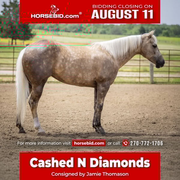 ⚜ The HERITAGE Classic ⚜ Happening now thru MONDAY | AUGUST 11th - Available EXCLUSIVELY on HorseBid's website! For more details and to register visit: www.Horsebid.com CONSIGNOR CONTACT: Jamie Thomason 270-772-1706 LOCATION: Auburn, KY BREED: APHA REGISTERED: Yes REGISTERED NAME: CASHED N DIAMONDS COLOR: Palomino HEIGHT: 14 AGE: 8 GENDER: Mare Introducing CASHED N DIAMONDS, respectfully known as Harley! An 8 yr old, APHA, palomino mare, standing 14 hands. An own daughter of NRHA Million Dollar Sire, BIG CHEX TO CASH with LTE of $220,826 & Offspring Earnings of $1,342,000+. In the arena, out on the trail, heeling steers in the roping pen, or working on the ranch this pretty lady is not only there to get the job done, but to get it done with style! Harley has a beauty that is unmatched, paired with flawless conformation, and the training to be an asset in a variety of disciplines. Harley is soft in the face, travels both directions collected & on the correct lead. Moves laterally off leg pressure, has a smooth stop, and a nice turn around. On the trail, Harley rides alone or in a group, crosses water, downfall, and navigates rough terrain. She is no stranger to a days work. Has been taken out west to brandings, used to move cattle on the farm alongside working stock dogs, open & closes gates. She’s quiet in the roping box, scores well, has quick speed that would easily transition to breakaway or the barrel pattern. Truly a versatile horse! If you're searching for the perfect partner…..whether it's a horse for the arena, a standout in the roping pen, a fun trail companion to explore the great outdoors, or a mare with the pedigree, presence, and conformation ideal for a broodmare—Harley is your girl! With her versatile talent, proven bloodlines, and eye-catching looks, she checks all the boxes for riders and breeders alike. Don't miss the chance to add this exceptional mare to your barn! For any other question or if you would like to meet Harley in person before adding her to your family, feel free to reach out!