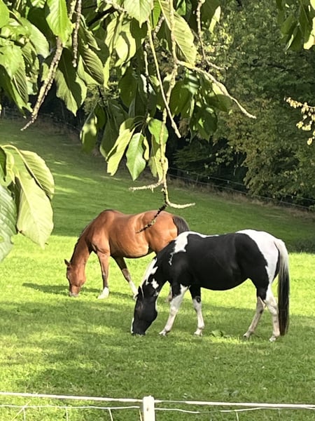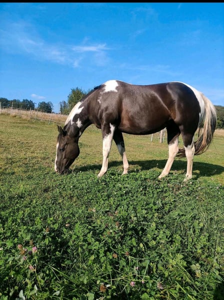 Wir suchen ein neues, passendes Zuhause für unsere American Paint Horse Stute Great Paula, geboren am 19.06.2018. • 5 Panel Test n/n • Kleine AKU liegt vor • Zähne im Dezember 2025 gemacht • Regelmäßig geimpft (Influenza/Tetanus) • Läuft barhuf, im Gelände je nach Untergrund mit Hufschuhen • Gebisslos geritten • Kennt Tierarzt, Huforthopäde, Verladen, Osteopathin Paula steht bei uns im Offenstall. Sie ist sehr robust und wurde diesen Winter nur wenige Male eingedeckt. Eine Box für die Nacht kennt sie ebenfalls. Letztes Jahr war sie für drei Monate im Beritt. Sie geht sehr gerne ins Gelände, mag die Bodenarbeit, auch mit Stangen und Schrecktraining, da ist sie neugierig und aufmerksam. Wir nehmen Unterricht in der Halle, das ist für sie auch kein Problem. Mit anderen Pferden ist Paula sehr sozial und eher rangniedrig. Wir können sie uns gut in einer größeren Herde vorstellen. In unserer kleinen Konstellation mit nur einem Wallach rosst sie recht stark. Bei der Vorbesitzerin hatte sie bereits ein gesundes Fohlen. Wenn sie alleine bleiben soll, wird sie eher unruhig. Als im letzten Sommer eine weitere Stute bei uns stand, war Paula deutlich entspannter. Generell profitiert sie von regelmäßiger Arbeit und lernt schnell. m Umgang ist sie freundlich und verschmust. Kinder können sie problemlos putzen, einflechten, führen und mit ihr am Boden arbeiten. Reiterlich darf Paula noch weiter gefördert werden, wir können sie uns auch gut als Wanderreitpferd vorstellen, da sie gerne querfeldein, durch Wasser, über Baumstämme und verschiedenes Gelände geht. Bei uns bekommt sie 24/7 Heu und im Sommer rund um die Uhr Weide, was sie super verträgt. Ein für sie angepasster Deuber Sattel kann mit gekauft werden. Bei Interesse freuen wir uns über eine kurze Nachricht mit ein paar Informationen zum zukünftigen Zuhause, wir melden uns dann zurück!