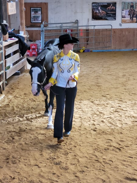 Wij zoeken voor onze BS Coosaders Boogie een nieuw, liefdevol thuis. Boogie is een merrie geboren in 2018, een Paint Horse met een schofthoogte van ongeveer 1,52 m. Ze is een nakomeling van Colonel Coosader en sinds 2022 in ons bezit. Ze loopt hoefbevangen en heeft tot nu toe geen hoefijzers nodig gehad. Ze wordt regelmatig gevaccineerd en ontwormd. In de winter staan onze paarden ’s nachts in de stallen, in de zomer genieten ze van 24 uur weiland. Met Boogie heb ik mijn Western rijbewijs 4 behaald en heb ik deelgenomen aan wedstrijden in klasse 4, waar ik in de disciplines Pleasure, Horsemanship, Showmanship en Ranch Riding ook placeringen behaalde. De wedstrijdsfeer heeft ze altijd kalm en zelfverzekerd doorstaan. Cursussen en intensieve training zijn echter niet haar favoriete bezigheden. Ze gaat liever het terrein in, maar doet graag mee aan de basiswerkzaamheden. Ze voelt zich vooral prettig bij rustige buitenritten. Zowel in een groep als alleen is ze goed hanteerbaar. Boogie heeft een vaste vertrouwenspersoon nodig, ze is zeker een ‘one-man’ paard en is aanvankelijk terughoudend tegenover onbekende ruiters. In 2024 heeft Boogie een prachtig hengstveulen gekregen. Ze heeft bij de eerste poging met vers sperma meteen drachtig geworden en zowel de dracht als de bevalling probleemloos doorstaan. Daarom kunnen wij haar ook goed in de fokkerij blijven inzetten (5-panel N/N). Helaas hoest Boogie bij slecht hooi. Tijdens de zomermaanden vertoont ze geen symptomen. In de winter- en voorjaarstijd kan de hoest echter optreden bij vochtig, koud of mistig weer. Daarom wordt ze bij voorkeur als fok- of recreatiepaard aangeboden. Wij wensen haar een thuis toe met een vaste vertrouwenspersoon die haar de tijd geeft en zich aan de omstandigheden aanpast. Voor meer informatie sta ik graag klaar voor een persoonlijk gesprek.