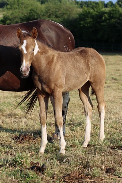CHEYENNES VUDUTELLA Classic Champagne Tobiano APHA mare. Born: 24.05.2025 Expected height approx. 150 cm 7 Panel N/N Ee aa CHch Tt