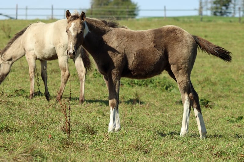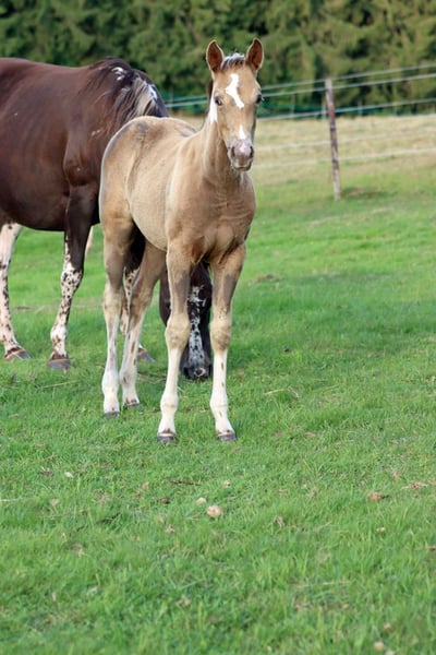 CHEYENNES VUDUTELLA Classic Champagne Tobiano APHA Stute. Geboren: 24.05.2025 Endgrösse ca 150 cm 7 Panel N/N Ee aa CHch Tt