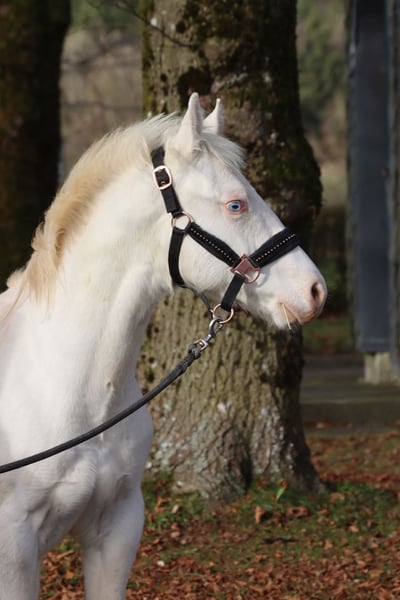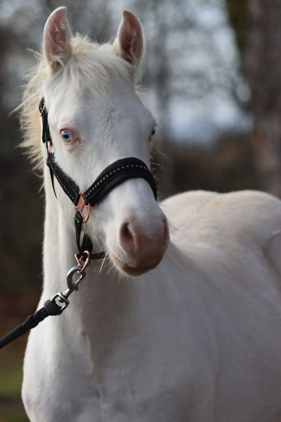 FHB CASH WIMPYS GUN "Ghost" Palomino (maar de palomino is niet zichtbaar omdat zijn maximale witheid zijn hele lichaam bedekt door zijn witte bonting. Bijna een echt eenhoorn zonder hoorn ;) ) Splash en Tobiano (frame overo wordt nog getest) Geboren: 6 mei 2025 Eindhoogte ongeveer 150 cm ee Aa CRcr Tt SW2/N W20/N