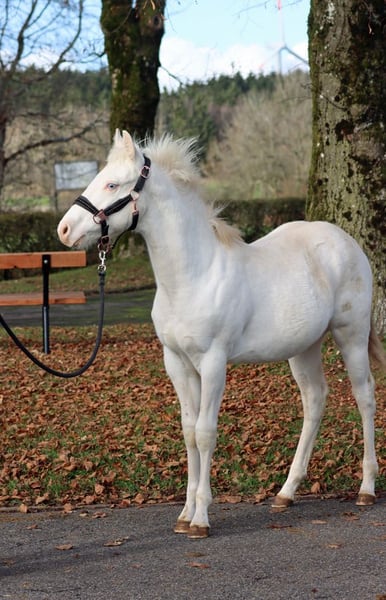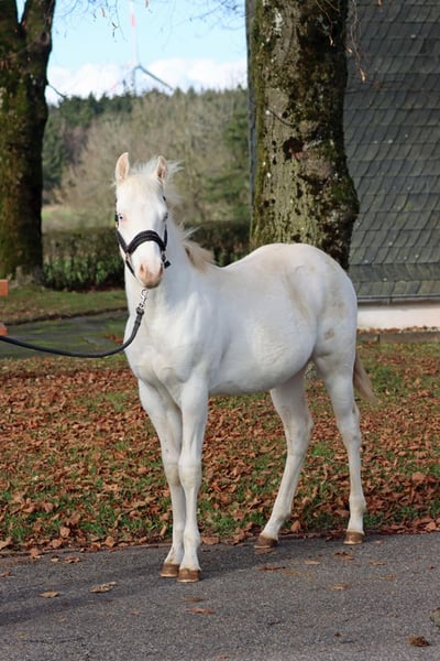 FHB CASH WIMPYS GUN "Ghost" Palomino (although the palomino coloration is not visible because he is almost completely white, with his white coat covering his entire body—almost a real unicorn without a horn ;) ) Splash and Tobiano (frame overo still to be tested) Born: May 6, 2025 Final height approximately 150 cm Genetics: ee Aa CRcr Tt SW2/N W20/N