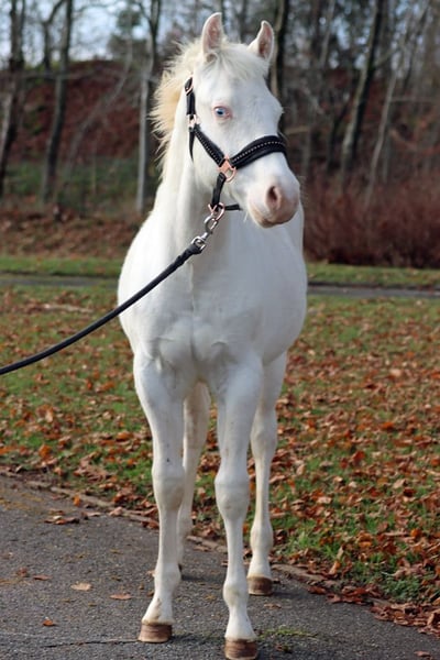 FHB CASH WIMPYS GUN "Ghost" Palomino (aber das palomino is nicht sichtbar weil ihr maximum weiss ist so seine weisse scheckung deckt sein ganzen Körper ab. Fast ein echter Einhorn ohne Horn ;) ) Splash und Tobiano (frame overo wird noch nachgetestet) Geboren: 06.05.2025 Endgrösse ca 150 cm ee Aa CRcr Tt SW2/N W20/N