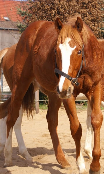 Schicker Paint Horse Hengstjährling, toller Body mit schöner Bewegung, weit entwickelter Strahlemann, wird groß und kräftig, jetzt schon über 140 cm, korrekt und wüchsig, auffällige Blesse, menschenbezogen, volles Papier, artig, jeden Tag an der Hand