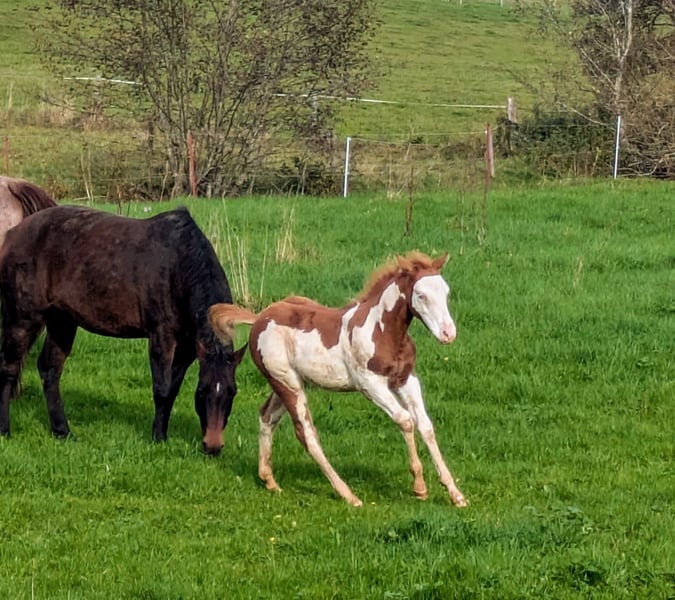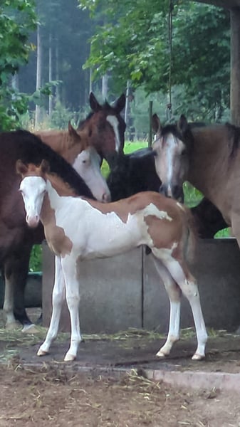 For sale: American Paint Horse Stallion – Splash Overo, Year of Birth 2024 We are offering a stunning American Paint Horse stallion born in 2024. HI JACK TOP GUN impresses with his beautiful coat pattern and friendly temperament. With an estimated final height of 14.7 hh, he falls within the standard size for purebred horses. If you are looking for a versatile and well-balanced horse, Hi Jack is the right choice. The young stallion is healthy, well-socialized, and lovingly raised. He is suitable for both leisure riding and show or breeding purposes. His parents are known for their excellent character and soundness. They are also available for viewing, as are two older full siblings of Hi Jack. Hi Jack Top Gun’s maternal lineage traces back to a Stock-type Ranch Horse mare with a solid foundation, a sensible nature, and exceptional rideability. His dam, JOKERS ENTERPRISE, is a Quarter Horse mare with lines renowned for resilience and versatility from Canadian bloodlines. His sire combines the most successful reining lines with outstanding temperament and an incredible willingness to learn. His sire, WHIZ MY LITTLE GUN, is an exceptional stallion bred by Steffen Breug, known for his gentle and kind nature, so much so that foals grow up together with their dam and sire in a herd environment. Like his parents, Hi Jack has a friendly, very pleasant character. Nothing easily unsettles him. He enjoys exploring his surroundings and is curious about new things. His elegant movement reflects his reining pedigree. He loves attention and learning new skills. He is accustomed to grooming, hoof trimming, walks, and trailer loading. Next on his training list are trail rides as a lead horse. Paint Horse registration papers are in progress. Please feel free to contact me for further information or if you are interested. Viewing possible by appointment.