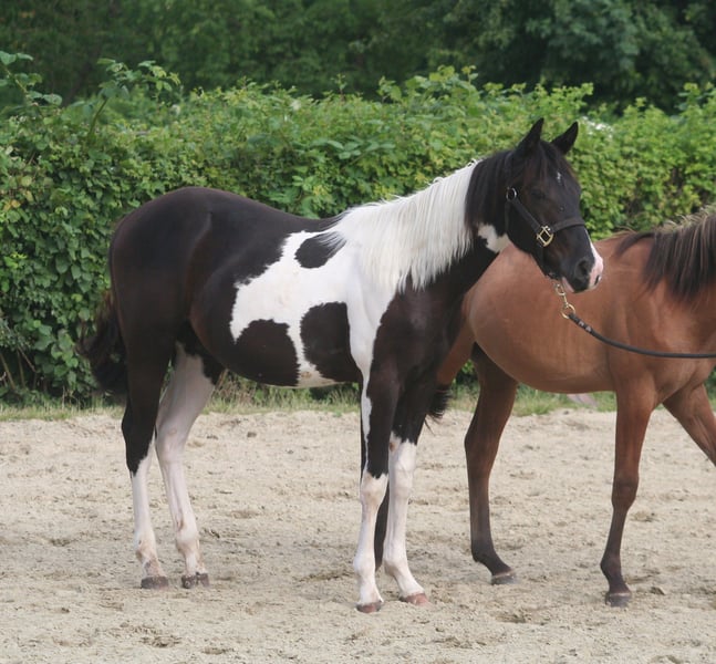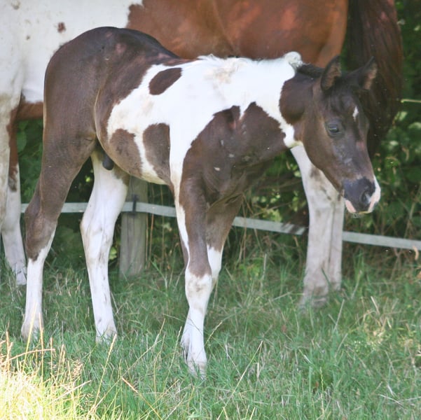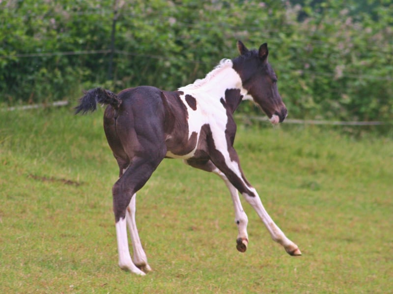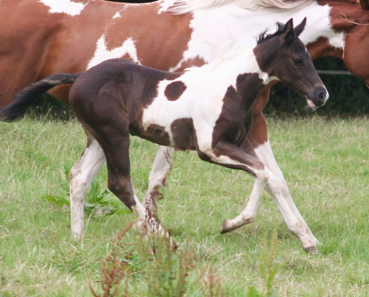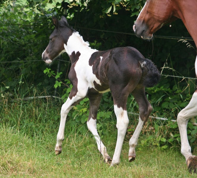 Tobiano Paint Horse Hengst in Black. Gleichmäßig gezeichnet mit zwei dunklen Augen. Auf Grund seines aufgeschlossenem Wesen und seinem athletischem Körperbau mit ausgewogener Bemuskelung verspricht er ein vielversprechender Sport und Freizeitpartner zu werden. Er wächst im Herdenverband auf. Mit PHCG Pass und APHA Papier. 5 Panel Test durch die Eltern. Vater ist beim PHCG gekört. Die Mutter wurde als Siegerstute der Zuchtschau prämiert und ist auf Rang 5 der 2022 Deutschlandweit prämierten PHCG Stuten. Im Pedigree befinden sich Vererber wie Merada Chex, Doc Chex, Yellow Mount, Sugar Bars, Doc Quixote und Smart Chic O Lena Anfragen bitte telefonisch