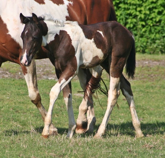 Tobiano Paint Horse stallion in black. Evenly marked with two dark eyes. Due to his outgoing nature and his athletic build with balanced muscling, he promises to be a promising sport and leisure partner. He will grow up in a herd. With PHCG passport and APHA paper. 5 panel test by the parents. Sire is licensed by the PHCG. The dam was awarded as champion mare of the breeding show and is ranked 5th of the 2022 Germany-wide awarded PHCG mares. The pedigree includes sires such as Merada Chex, Doc Chex, Yellow Mount, Sugar Bars, Doc Quixote and Smart Chic O Lena
