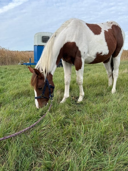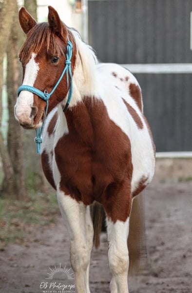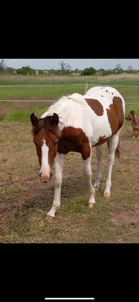 Sehr gelassener zutraulicher Jährlings -Hengst abzugeben. Er wurde am 13.6.24 geboren . Aus eigener Zucht . Farbe Bay . APHA Papier. Die letzten Fotos zeigen ihn als Fohlen . Über seinen Vater *DANCING BOYS OKIE* und seine Mutter *KIWAS LITTLE CHEYENNE* ist er tobiano homozygot (vererbt immer seine Scheckung) und 7 - fach Panel negativ . Er hat also Reining - und Allround- sowie Cowhorse - Gene . Er wird sicher ein guter Partner im Freizeit Reiten werden . Er wäre aber auch für den Sport offen . Er muss aber kein Hengst bleiben. Er kennt Hunde , Katzen und auch Lärm von Landmaschinen und zeigt dabei seinen unerschrockenen ruhigen Charakter. Leichte Nach Aussen Stellung des rechten Hufes ab dem Fesselgelenk , was ihn aber in keiner Weise beeinträchtigt in allen 3 Gangarten . Ist bisher deutlich besser geworden und wird bei entsprechender Hufbearbeitung sich im Laufe des weiteren Wachstums noch verbessern . Daher der angesetzte Preis . Er wächst mit anderen Junghengsten auf und war vorher mit seiner Mutter in einer gemischten kleinen Herde auf großen Koppeln . Er gibt brav die Hufe , Hänger ist kein Problem , kennt bereits Fellsattel und leichte Gewichte , ist natürlich halfterführig, geimpft , entwurmt . Er ist neugierig und offen , bleibt stets gelassen . Er kann natürlich gern besichtigt werden .