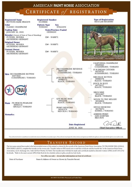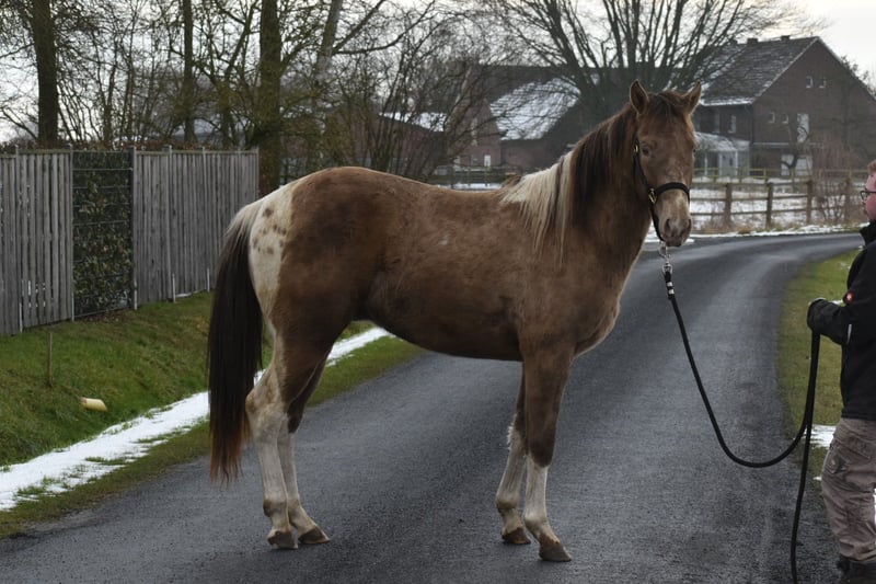 **Verkaufsanzeige: American Paint Horse Hengst – Tobiano, 2024 geboren** Wir freuen uns, Ihnen einen vielversprechenden American Paint Horse Hengst vorstellen zu dürfen. Geboren im Jahr 2024, besticht dieser junge Classic Champagne Hengst durch seine beeindruckende Farbgebung Homozygot für Tobiano und Black. Das macht ihn zu einem echten Blickfang.Mit einem Stockmaß von ca. 154 cm zur Zeit und befindet er sich noch im Wachstum sein Endm. wird ca 160 cm wo er eine optimalen Größe für vielseitigen Einsatz bekommt. Sein freundliches Wesen und seine ausgeglichene Natur machen ihn sowohl für den ambitionierten Freizeitreiter als auch für den zukünftigen Zuchtbetrieb interessant. Dieses Pferd vereint typische Rassemerkmale mit einem modernen Erscheinungsbild und für den Allround Bereich. Es ist ein idealer Partner für alle, die einen jungen und vielversprechenden Hengst/ Wallach suchen. Bei Interesse oder weiteren Fragen stehen wir Ihnen gerne zur Verfügung. Ein persönliches Kennenlernen ist jederzeit möglich.