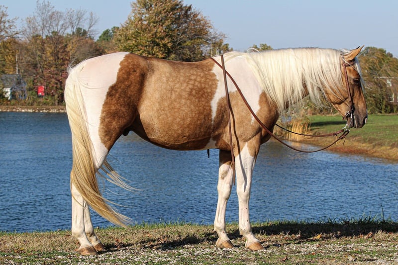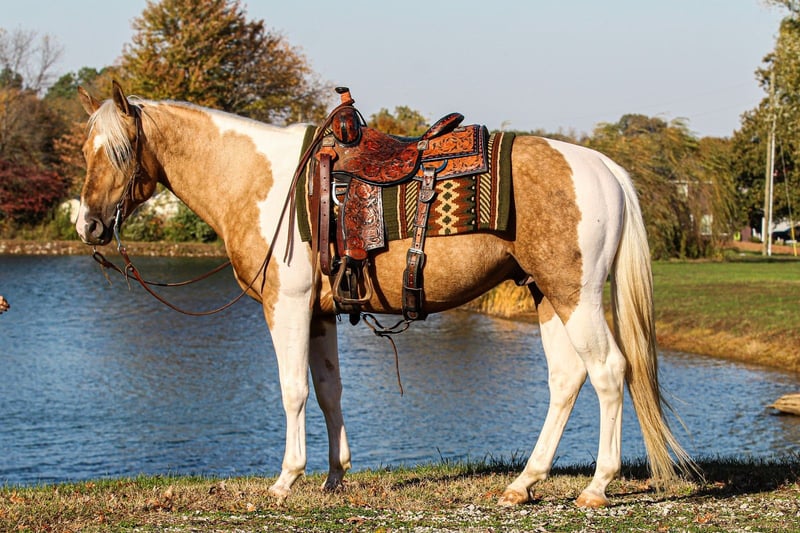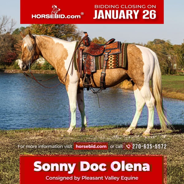𝐉𝐀𝐍𝐔𝐀𝐑𝐘 ⭐️𝑨𝒍𝒍 𝑺𝒕𝒂𝒓 𝑳𝒊𝒏𝒆𝒖𝒑⭐️ Happening now thru MONDAY | JANUARY 26th - Available EXCLUSIVELY on HorseBid's website! For more details and to register visit: www.Horsebid.com CONSIGNOR CONTACT: Pleasant Valley Equine 270-635-5572 LOCATION: Robards, KY BREED: APHA REGISTERED: Yes REGISTERED NAME: Sonny Doc Olena COLOR: Palomino Tobiano HEIGHT: 15.1 AGE: 6 GENDER: Stallion Sonny is a coming 6-year-old registered APHA stallion, standing 15.1 hands tall. He has all the chrome in all the right places, with a mane and tail of a real-life Barbie dream horse. Sonny is very well built in confirmation and bone structure. Sonny was bred and raised for his entire life by the same individual and has been in my training program for six months. He has been very willing and receptive in all of his training from day one. Whether you choose to ride in the arena or outside, he does his best to please. Sonny has a nice walk, trot, and canter, naturally picks up his correct leads, and has pretty rollbacks. He will sidepass to open gates, trots over ground poles, been through the obstacle course, and has crossed over bridges, logs, and through water and creeks with ease. Sonny has also been through our desensitizing program as well, exposing him to things such as tarps, whips, traffic, and farm machinery. His resume also includes him checking cattle and trail riding. He stands politely for the farrier, clipping, bathing, saddling, and loads in the trailer with ease. Sonny’s options are endless! He has a very solid foundation and is ready to go in any direction of your choosing. Ranch horse, rope horse, breeding program, or make him a gelding and have a life-long trail partner. Sonny sells 100% sound, with no vices.