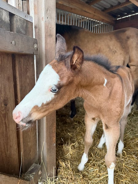 Hes A Diamond Chex ist ein hochwertiges Paint Horse Hengstfohlen, geboren am 29.03.2026, in der außergewöhnlichen Farbgebung bay dun overo splash (Farbtest läuft). Mit einem zu erwartenden Endmaß von ca. 153 cm präsentiert er sich als kompakter, korrekt gebauter und vielversprechender Nachwuchshengst mit guten Proportionen und viel Ausdruck. Dieses Hengstfohlen überzeugt nicht nur optisch als absoluter Eyecatcher, sondern auch durch seine natürliche Präsenz und seine lockere, elastische Bewegungsqualität. Durch seine interessante Abstammung eignet er sich besonders für den Reining- und Allroundbereich, ist ebenso für den ambitionierten Freizeit- oder Turnierreiter eine spannende Perspektive. Charakterlich zeigt er sich außergewöhnlich menschenbezogen, freundlich und unkompliziert. Er ist neugierig, clever und gleichzeitig gelassen in neuen Situationen. Typisch Fohlen bringt er eine fröhliche, leicht freche Art mit, bleibt dabei aber stets cool und nervenstark. Umweltreize wie Landmaschinen, Autos und alltägliche Geräusche kennt er bereits und nimmt diese völlig entspannt an. Hes A Diamond Chex wächst artgerecht im Herdenverband mit anderen Fohlen auf und wird hochwertig aufgezogen. Er erhält altersgerechtes Aufzuchtsfutter, ist regelmäßig entwurmt und gesundheitlich unauffällig. Der aktuelle 5-Panel-Test ist n/n. Im täglichen Umgang wird er konsequent, aber liebevoll gehändelt. Er kennt bereits den Tierarzt sowie den Hufschmied und wird ans Halfter gewöhnt. Das Fohlen-ABC wird kontinuierlich gefestigt. Zusätzlich kennt er das Verladen und fährt problemlos im Anhänger. Auch erste Ausflüge ins Gelände gehören bereits zu seiner Entwicklung. Dieses Paint Horse Hengstfohlen bringt beste Voraussetzungen für eine Zukunft im Sport sowie im gehobenen Freizeitbereich mit. Durch seinen Charakter, seine Nervenstärke und seine natürliche Coolness ist er sowohl für ambitionierte Turnierreiter als auch für Freizeit- und Familienpferdehalter interessant.