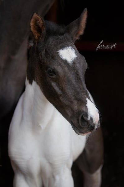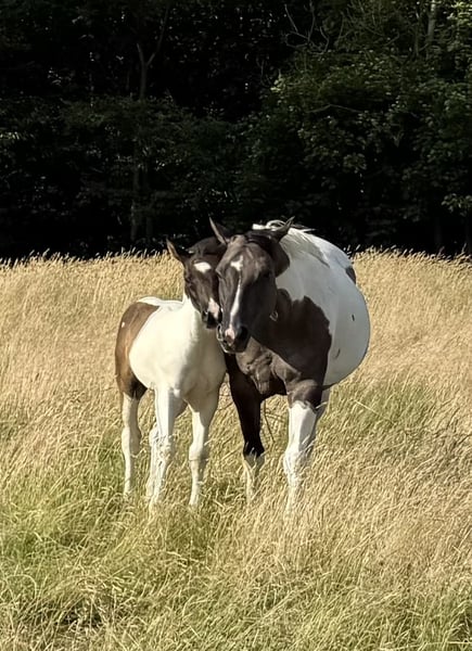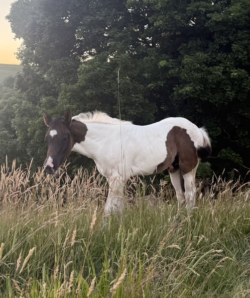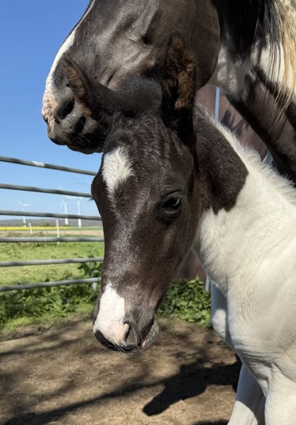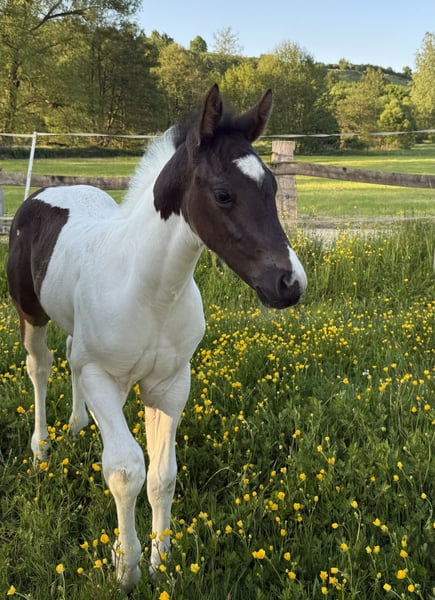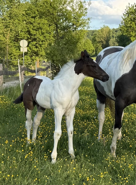 Raven is a cuddly, well-behaved colt with an incredible presence. He comes from a well-bred bloodline, and like all my foals, he is raised in a herd environment and is already accustomed to being taken on rides, helping him become familiar with different experiences. He may be homozygous for black and Tobiano, but this still needs to be tested. He is also already familiar with trailer loading. Here are some key details: Breed: Paint Horse (APHA papers and E-Pass from PHCG) Sire: Rocky Mountain Music Dam: Cheyennes Candy Cane Born: April 25, 2025 Color: Black Tobiano Estimated final height: 15.5 hh Genetic testing: 5 Panel N/N, MYH1 N/N, OLWS N/N Visits are almost always possible and very welcome. Price is negotiable, and installment payments are available.