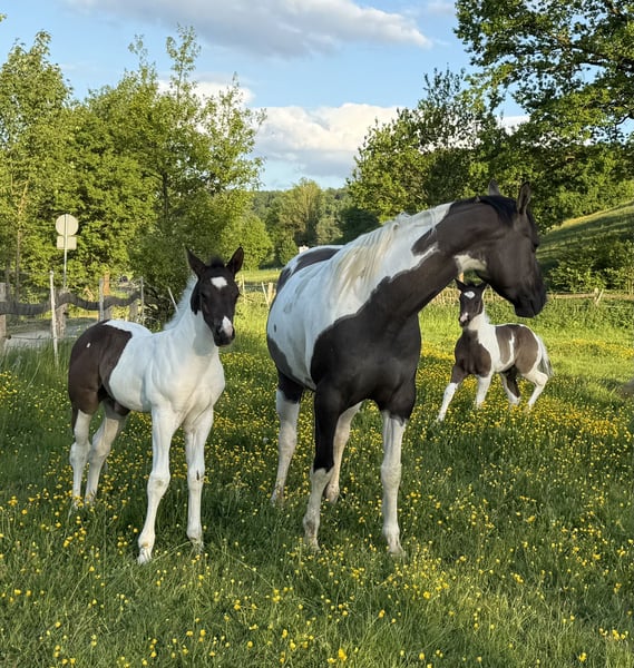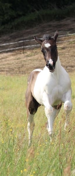Raven est un poulain hongre câlin et bien élevé avec une méga présence. Raven provient d'un croisement de qualité, comme tous mes poulains, il grandit en troupeau et participe à des sorties, ce qui lui permet de découvrir beaucoup de choses. Il connaît également déjà le transport en van. Voici quelques données clés : Race : Paint Horse (papier APHA et E-Pass du PHCG) Père : Rocky Mountain Music Mère : Cheyennes Candy Cane Né le 25.04.2025 Couleur : Black Tobiano Taille estimée à l'âge adulte : 155 cm 5 Panel N/N, MYH1 N/N, OLWS N/N Les visites sont possibles et souhaitées presque à tout moment. Place avant prix.