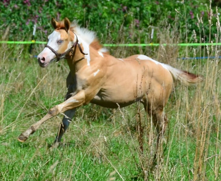 Jackson jest homozygotyczny dla genu Tobiano. Zawsze będzie miał kolorowe źrebaki. Ma promiennie niebieskie oko. Genialny rysunek i wspaniała sylwetka! Oczywiście ma 7 Panel N/N. Dorasta w odpowiednich warunkach na dużych przestrzeniach w dużej stadzie. Posiada papiery od APHA i paszport od PHCG.