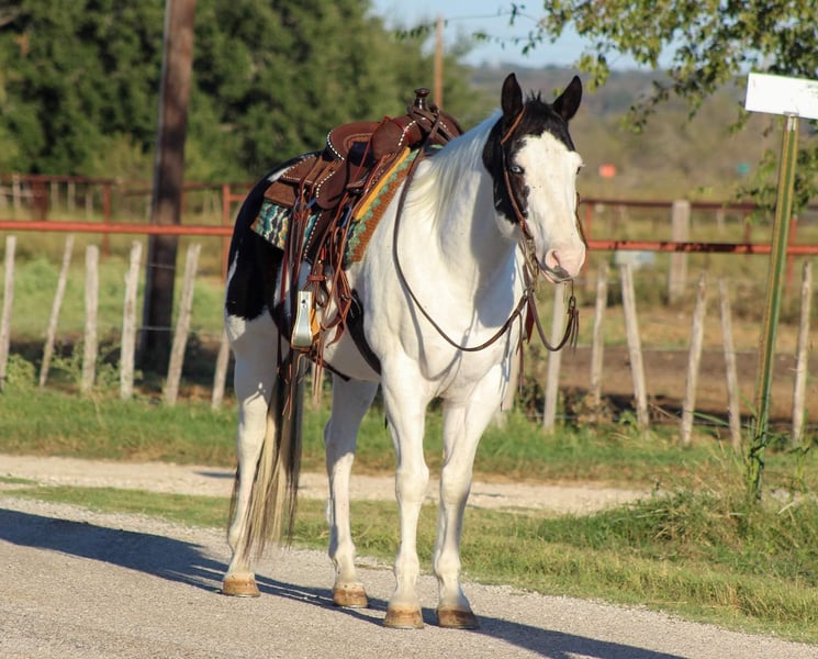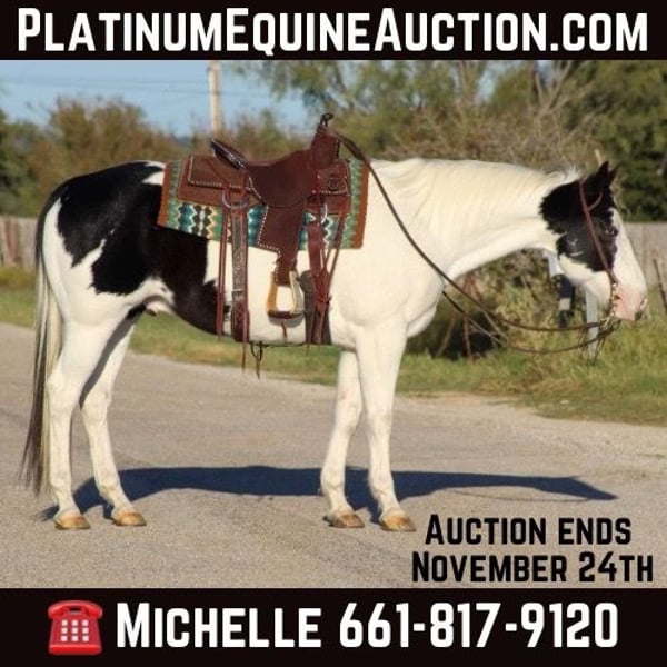 ONLINE AUCTION Place your bids at www.PlatinumEquineAuction.com Starting Bid $3500 Auction ends November 24th, 2024 Need a new saddle? Check out White Rock Saddles on our website or Facebook! Let me introduce to you this GORGEOUS one of a kind gelding known as Captain . He is a 8 year old black and white paint gelding standing 15hds tall. Captain is uniquely marked with blue eyes, a two tone black and white tail . This guy is GORGEOUS and is for sure going to get you noticed wherever you may take him. He has spent most of his young life on a ranch while doing all of the ranch chores , he has roped sick cattle outside, he has seen many many miles out on the ranch gathering and also checking fence. Captain has a awesome little lope to him and he will lope right out of your hand like butter , he is one handed broke, neck reins, moves off your leg , he will walk,trot and lope circles in the arena or out in the open field. He goes down the trail wherever you point him, ride him on the steep mountain trails or out in the flat grasslands he handles it all. Hes user friendly and isn’t complicated to ride at all. Captain is traffic broke he’s been rode down busy hwys, and also down at the Fort Worth Stockyards where he starred in a group of high schoolers school project , he was obviously the STAR of the show!!! And had great patience through it all. He has been rode in rodeo grand entry’s and parades. Everyone loves a gorgeous paint horse , I guarantee you won’t find another one like him!!! Captain will self load into the trailer, he stands tied with patience and no nonsense, stands for the farrier, and loves his bath time. Hes easy to tack up and bridle. Stands to be mounted and also stands for the mounting block. He can be turned out in a herd setting or stalled. Contact us to come try him, or we can set up a FaceTime also. If you need help with transport don’t hesitate to ask we have a list of reputable haulers that can get him safely to your doorstep world wide from Stephenville, TX. Contact M $ Performance Hores Michelle 661-817-9120 with any questions. ONLINE AUCTION Place your bids at www.PlatinumEquineAuction.com Starting Bid $3500 Auction ends November 24th, 2024 Need a new saddle? Check out White Rock Saddles on our website or Facebook!
