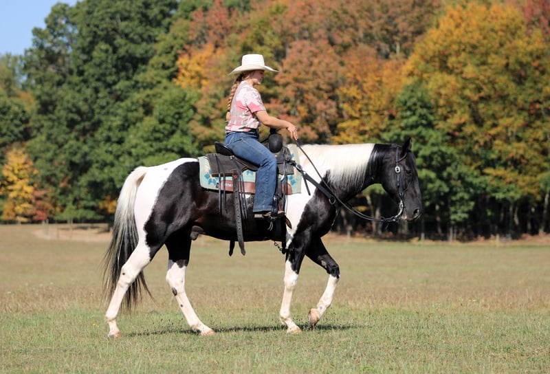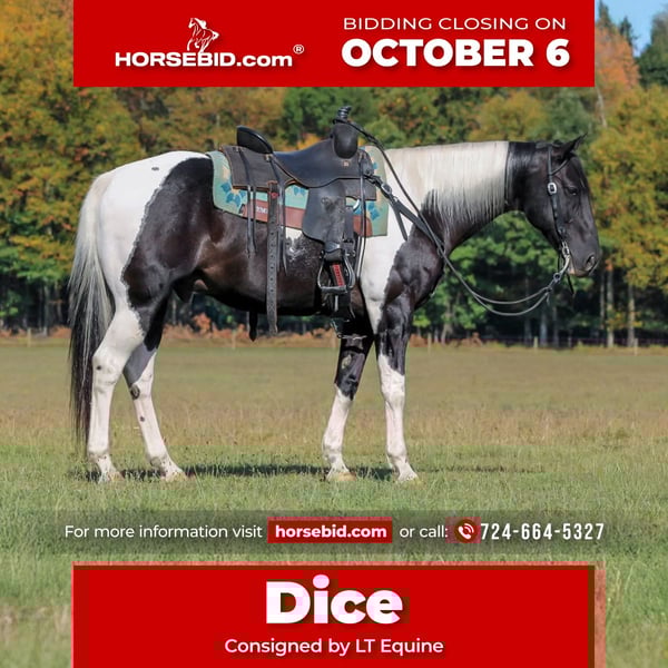 🍂 𝓐𝓾𝓽𝓾𝓶𝓷 𝑨𝑳𝑳 𝑺𝑻𝑨𝑹 𝑳𝑰𝑵𝑬𝑼𝑷 🍂 Happening now thru MONDAY | OCTOBER 6th - Available EXCLUSIVELY on HorseBid's website! For more details and to register visit: www.Horsebid.com CONSIGNOR CONTACT: LT Equine 724-664-5327 LOCATION: Miola PA BREED: Paint REGISTERED: No COLOR: Black and white Tobiano HEIGHT: 15.1 AGE: 10 GENDER: Gelding If you're looking for a fantastic trail horse with many miles under his belt for any level rider than Dice is your man! Dice has been a trail horse his whole life, he’s taken all levels of riders all over the countryside. He is a been there done that kind of horse. He is very chill and relaxed and takes the toughest trails with ease! Standing 15.1 hands tall and nicely built he can carry all sized riders. Dice has a fantastic loose one hand neck rein. He moves off leg and listens perfectly to his ques! He has a nice slow trot and a very smooth lope, dice will also arena ride where he can see his head and pick up both leads making him a great candidate for a lesson horse! Dice has very good ground manners, and is smart and respectful of your space. He will pick up all four feet with ease and is great for the farrier. Where dice really excels is on the trail, if your wanting a safe, confident, and quiet trail horse look no farther! He will go out alone, or in a group, lead or follow. He is traffic safe and not spooky or scared of the mud. If you have any more questions feel free to call or text! Thank you and give Dice’s video a watch!