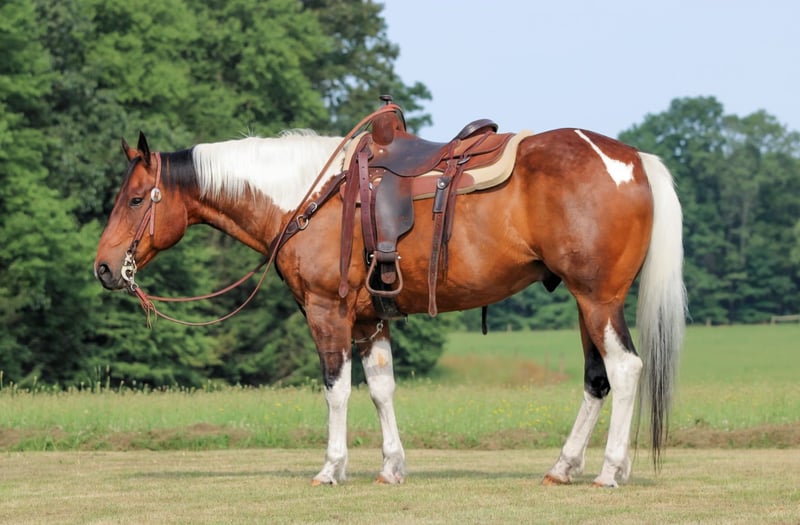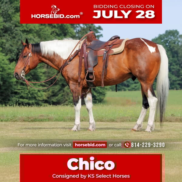⚔️ The HORSEMAN's Select ⚔️ Happening now thru MONDAY | JULY 28th - Available EXCLUSIVELY on HorseBid's website! For more details and to register visit: www.Horsebid.com CONSIGNOR CONTACT: KS Select Horses 814-229-3290 LOCATION: Clarion, PA BREED: Paint REGISTERED: No COLOR: Bay and White Paint HEIGHT: 15 AGE: 12 GENDER: Gelding Chico is a 12 Year Old Bay and White Paint Gelding. He stands 15 hands tall and is very stout made. He is built to carry any size rider. He stands beside the mounting block making it very easy to get on and get off. If you been looking for that super quiet and super gentle horse that anyone can ride and get along with then check out Chico. He is very quiet and gentle and is a great family horse. He has been primarily used as a family trail horse and has been used to go out and gather the cattle also. He is more whoa than go. If your a beginner or a timid rider Chico will help you gain your confidence and teach you to ride. If your a seasoned rider but just want a nice horse to have relaxing stress free rides on then Chico would be perfect for that. Chico is great on the trails and will go anywhere you ask him to go on the trail and never hesitates. Chico can be trail ridden alone or with other horses. He is traffic safe and good around four wheelers, tractors and other equipment. He has good ground manners and is good for the farrier and vet. Very friendly and easy to bond with. You will love how quiet , gentle and safe he is. Dont miss out on Chico! We can help arrange shipping anywhere in the United States . Call or Text Kris at 814-229-3290. Thank you and God Bless