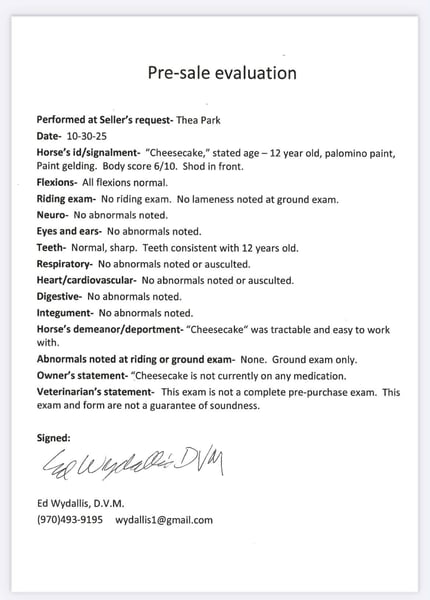 "AVAILABLE ON ONLINE HORSE AUCTION AT www DOT PlatinumEquineAuction DOT com BIDDING OPEN NOW thru SUNDAY | APRIL 19TH! *Final price will be determined on auction site* CONSIGNOR CONTACT INFO: Thea Park 970-632-3644 LOCATION: Fort Collins, CO ★★ CHEESECAKE ★★ “Cheese” – Athletic • Personable • Trail-Tested Gelding Cheesecake — affectionately known as Cheese — is the kind of gelding that instantly wins you over. With his bright, goofy personality and rock-solid trail experience, he’s equal parts entertainer and dependable partner. Friendly, fun, and full of try, he’s one of those horses that simply loves people and is always happy to go to work. Cheese is the first to greet you at the gate and gets along with everyone — horses, humans, even goats. He has a classic “puppy dog” personality, curious and engaging, and he brings a lot of joy to the barn. This gelding has seen it all. From navigating the busy streets of downtown to handling long miles in rugged mountain terrain, Cheese crosses bridges, water, tunnels, and brushes off commotion from traffic, strollers, dogs, or bikes without hesitation. He thrives in chaotic environments and makes even the wildest setting feel calm and rideable. Under saddle, Cheese is a blast to ride. He’s athletic, soft, and extremely responsive, Cheese is a very sensitive horse with a lot of go and forward motion in all gaits- He offers a smooth walk, a collected jog, and both an extended trot and canter. His stop is solid, rollback crisp, and he’s working on developing a nice spin. He’s the type you can take out with confidence .— he knows his job and enjoys it. He’s also been exposed to all kinds of obstacles and tasks: flags, tarps, dragging logs and barrels, and everything in between. Whether you’re wanting a handy ranch partner, a relaxed trail horse, or just a broke, sweet gelding with a ton of heart and a splash of humor — Cheese fits the bill. Watch his video and meet this one-of-a-kind guy in person — he’s every bit as fun as he sounds. For more information, contact Thea at 970-632-3644.