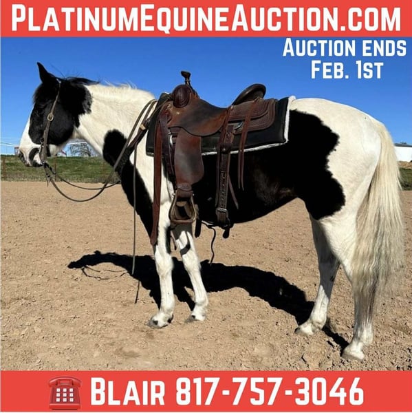 ONLINE AUCTION Place your bids at www.PlatinumEquineAuction.com Starting Bid $3500 Auction ends February 1st, 2026 Need a new saddle? Check out White Rock Saddles on our website or Facebook Zoey is a gorgeous 14.1H, 13 yr old black and white paint mare with one blue eye and a HUGE loving personality! She is a very gentle mare that is suitable for anyone! She’s incredibly safe and is the “more whoa than go” type. She’s been a trail horse the majority of her life and has been rode by various levels of riders. She is not a marish mare at all and she’s the bottom of the totem pole when turned out. Zoey is not spooky and handles all new adventures with ease! She has zero buck, bolt or bite and is the perfect easy going trail horse for anyone looking for something SAFE and gentle! She will neck rein, move off leg and switch gaits only when asked! Zoey is the kind you can leave off for weeks and jump on when it’s cold outside and not have to worry about any silly tricks. She’s absolutely gentle enough for the babies to be around/handle. She loves attention and has a huge loving personality! Zoey is great about all things and loads, leads, bathes, ties, and hauls with ease. She would make a great beginner horse, trail horse for anyone, or even lesson horse! She would be the perfect present for anyone looking for a starter horse for their kids this holiday season! Please call Blair with North Texas Horse Company for more info at 817-757-3046. We are located in Weatherford, TX and can help arrange affordable shipping to anyone!! ONLINE AUCTION Place your bids at www.PlatinumEquineAuction.com Starting Bid $3500 Auction ends February 1st, 2026 Need a new saddle? Check out White Rock Saddles on our website or Facebook
