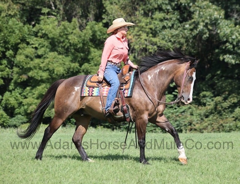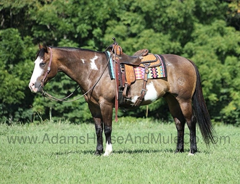 Go to www.AdamsHorseAndMuleCo.com for more pics and a video. AHAMC has been in the horse business and sold horses over the internet since 2005. We have a long track record of success with hundreds of happy customers. We work hard to match riders with the correct horses and specialize in beginner safe, family friendly horses that have been used and checked out by our family! Hercules is a super stout built dark buckskin overo gelding standing around 15.1hh. He is an 11 year old with lots of experience! Hercules has been used around the ranch for sorting and penning cattle. He has been pasture roped off of and doctored sick ones. Hercules is a great horse to rope out of the box on the head side and is one that a novice can take to jackpots and win on. Away from the ranch and ropings, Hercules is an awesome trail horse! He will mosey along slow and easy down the trails and he is a horse that the whole family can ride and one that will build everyones confidence levels! Hercules has been ridden in South Dakota, Oklahoma, Texas and throughout Kentucky. He will cross creeks, ditches, logs and navigate rough rocky areas. He is safe riding in traffic. He has a smooth jog, has a good stop, turns a circle both ways and backs with ease! Hercules has the one of the best lopes that you will ever set on, you just wont find one that is any softer or smoother! Hercules is a confident horse on the trails and will lead the crew, head out alone with no issues! He has been exposed to all kinds of wildlife such as deer or turkey or other animals like cows or dogs and will go anywhere that he is asked too. He has been rode many miles in the mountains of Eastern Kentucky and encountered every obstacle possible on the trail. He will go up or down even the steepest slopes, across deep creeks, over downed trees, and over all types of rough terrain while still being sure footed. Hercules is not cinchy, cold backed, does not crib or weave. Hercules is sure to be the family favorite for years to come!!! Feel free to call Eric 606-308-2461 with any questions.