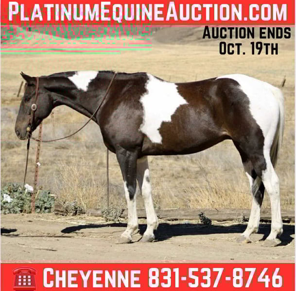 ONLINE AUCTION Place your bids at www.PlatinumEquineAuction.com Starting Bid $3500 Auction ends October 19th, 2025 Need a new saddle? Check out White Rock Saddles on our website or Facebook Checkers is a 12-year-old, 15.2hh Paint gelding with a calm, easy-going personality and a kind eye to match. He’s the type of horse that’s always a pleasure to be around, quiet on the ground, respectful of space, and enjoys attention. Whether you’re looking for a horse to enjoy the trails, ride in the arena, or continue developing for English or Western disciplines, Checkers has the foundation and temperament to go in just about any direction. In the arena, Checkers walk-trot-lopes on a loose rein with smooth transitions, a nice stop, and a collected reverse. He’s been ridden both English and Western, and with his floaty, soft movement and balanced gaits, he’s an excellent candidate for someone looking to continue him in English, he really catches the eye moving around the arena. He’s responsive without being too forward and has a willing attitude that makes him a great match for confident riders who want a horse that’s enjoyable to ride and work with. Out on the trail, Checkers goes where you want and has lots of stamina. He’s been ridden through parks, around town, and out on open trails. He’ll go out alone or in a group without fuss, and he handles trail obstacles with ease. He’s sure-footed, calm in new environments, and doesn’t get rattled by activity around him, he’s been exposed to a lot and takes it all in stride. Checkers hauls and loads with no issues and gets along well with other horses in turnout or when riding out. With his solid training, friendly personality, and good looks, Checkers is the kind of all-around gelding that’s getting harder to find. He is located in Bitterwater, CA. Please call Cheyenne Rey at 831-537-8746 for any more info. ONLINE AUCTION Place your bids at www.PlatinumEquineAuction.com Starting Bid $3500 Auction ends October 19th, 2025 Need a new saddle? Check out White Rock Saddles on our website or Facebook